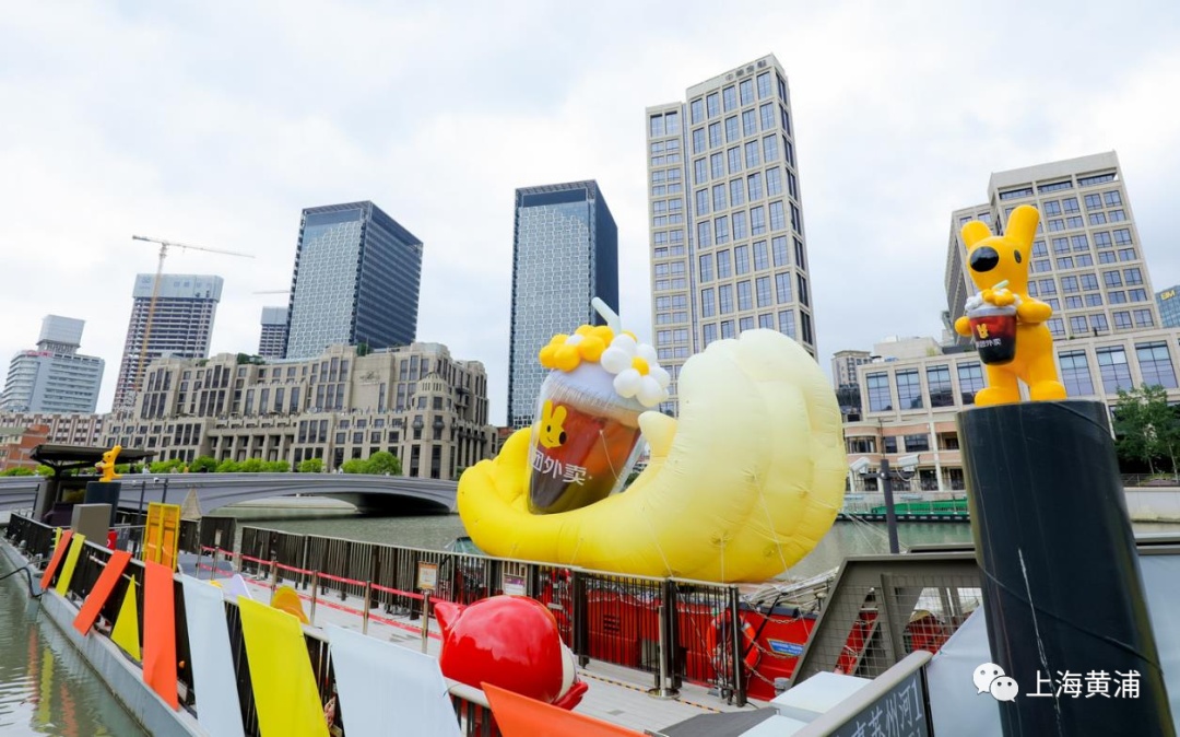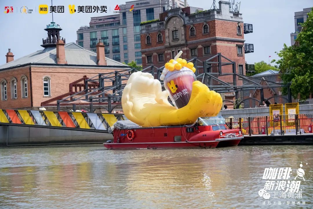 记者在现场看到,苏州河中央还摆放了“浪尖上的咖啡”艺术装置,由数字艺术家土豆人与美团外卖共同设计,一朵大浪花载着一杯咖啡,摇曳在苏州河上,形象化地呈现了“咖啡新浪潮”的巨大魅力,吸引众多市民热情打卡。
