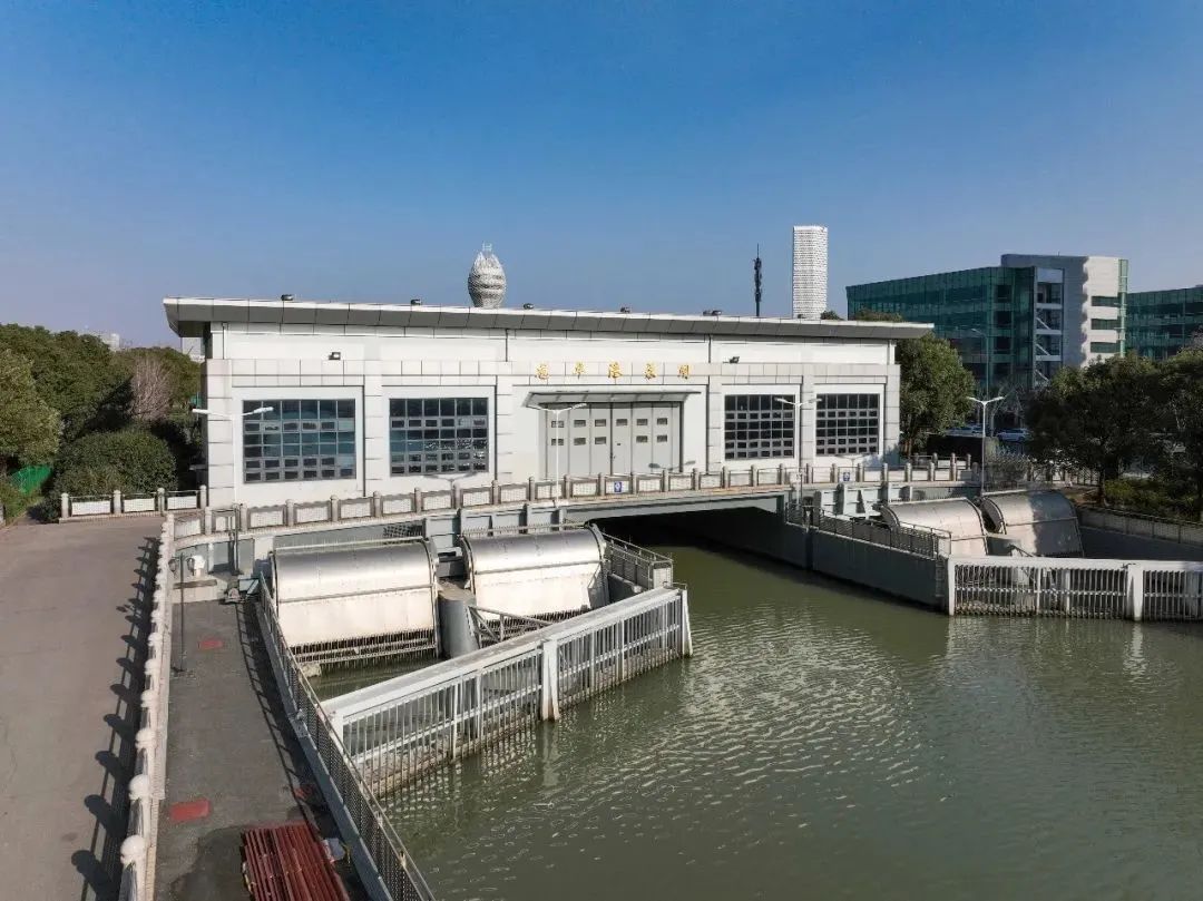 龙华港泵闸位于龙华港距黄浦江河口约236m处,位于河道的顺直段,上、下游均有一定长度的引渠,防洪岸线长度适中,水流平顺,适合泵闸的运行,泵闸进出水流条件较好。工程由一座12m宽的节制闸与两台单机流量22.5m³/s的斜式轴流泵组成,新建泵闸主要任务是防洪、挡潮、排涝及水资源调度。泵闸总体布置采用“泵+闸+泵”布置形式,即节制闸布置在河道中间,泵房对称布置在闸两侧,是淀北片最大的排涝口门。