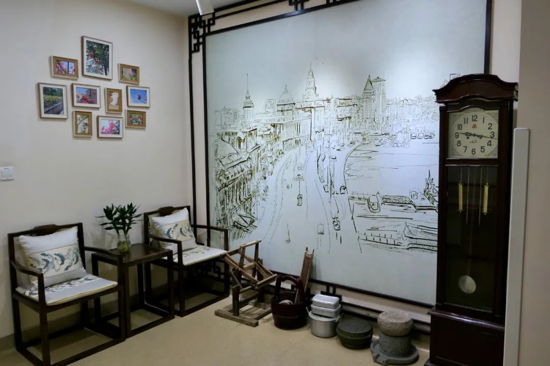 认知症照护专区内部设有记忆家园、怀旧角、记忆墙角、记忆盒子、记忆走廊等区域。在记忆家园区域,墙面上放置有各种积木类益智互动装置和不同布料做成的装饰画,还有一台有着四十余年历史的“三五牌”座钟,通过视觉、听觉、触觉等方面的激活训练,能帮助认知症老人加强感官感受,延缓认知症发展进程。