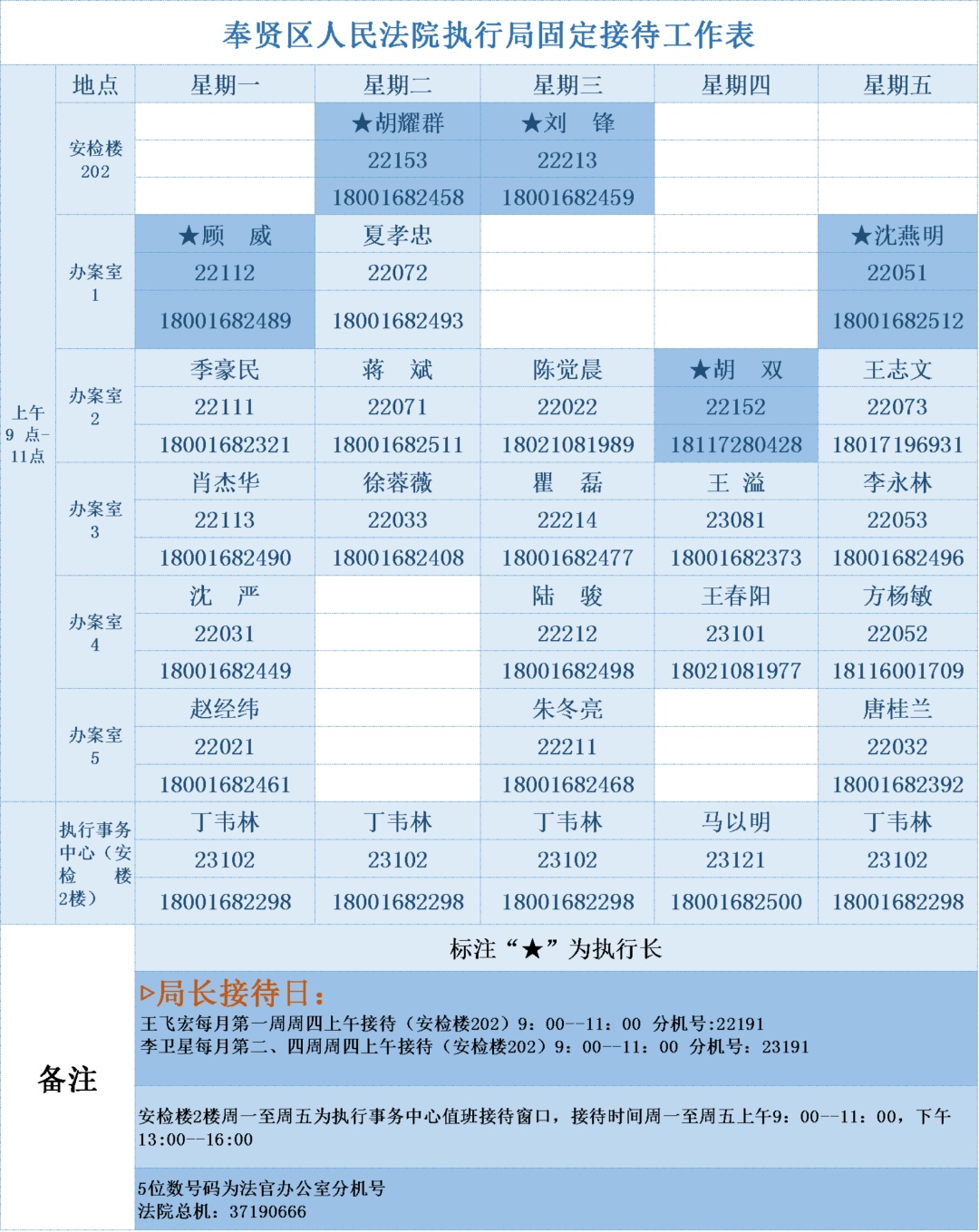 接待地点:奉贤法院第1到第5办案室,安检楼202室