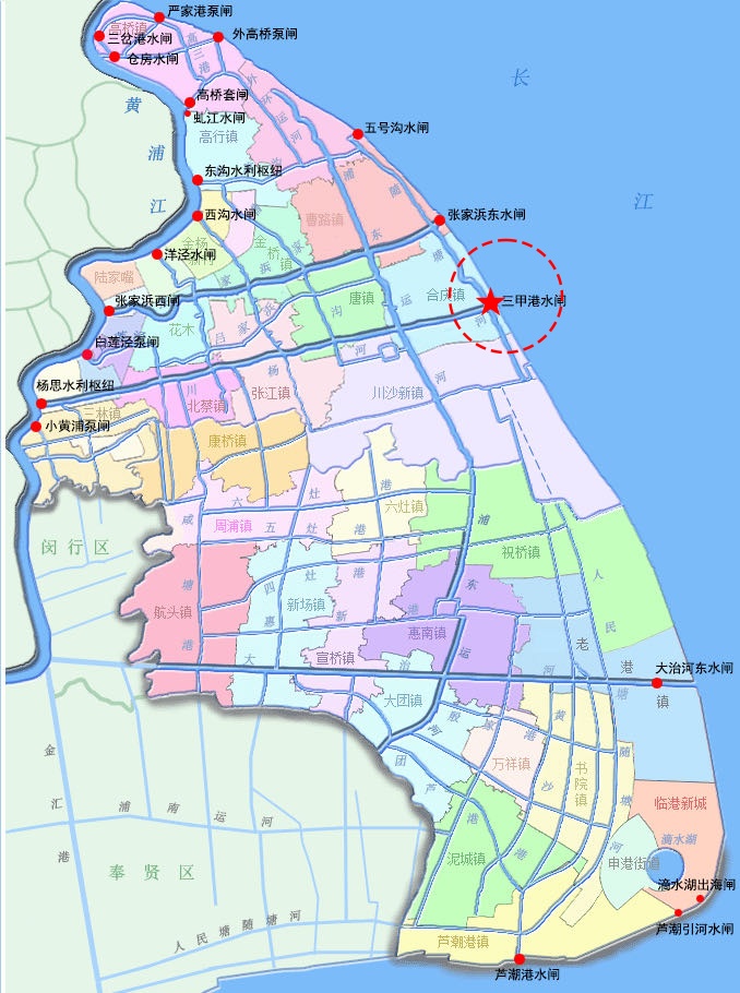 三甲港水闸雄踞人民塘上,东临长江口,西接川杨河,是浦东新区中北部地区最重要的引水口门,也是浦东连通长江口的重要水利设施之一。