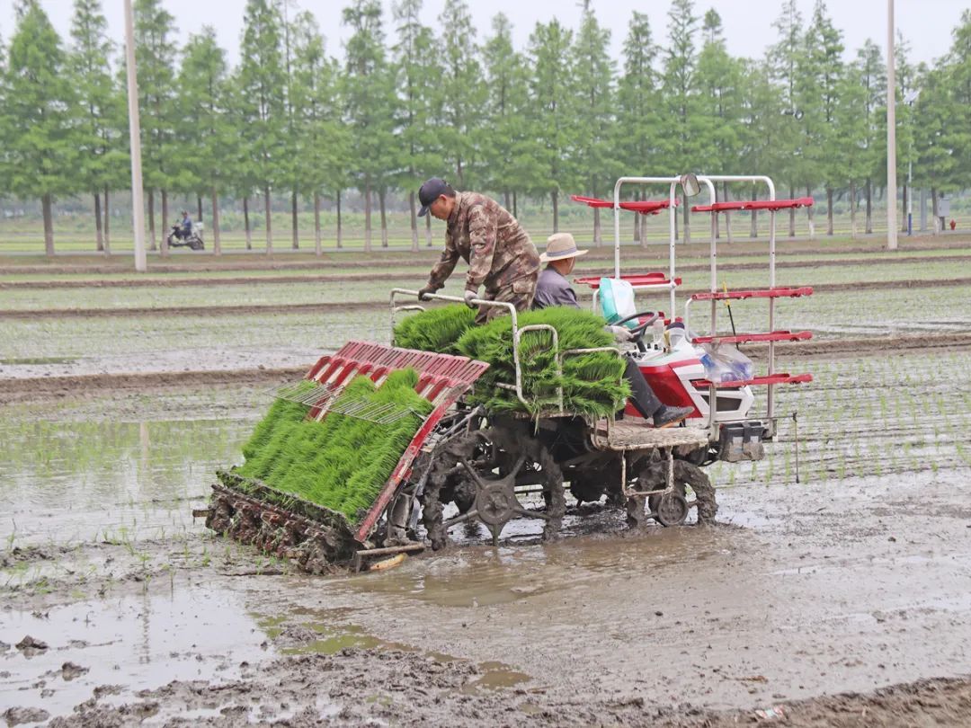 在小朋友们下田之前,小昆山镇旅游公司的宣讲员为大家介绍了小昆山镇的历史文化及农业情况。随后,孩子们穿着套鞋下田,在带教人员的指导下,左手拿苗、右手插秧,拿捏深浅,斟酌间距,将秧苗一束束认真插入水田中。一旁的小昆山镇农民正在用插秧机进行播种,田间一片繁忙景象。