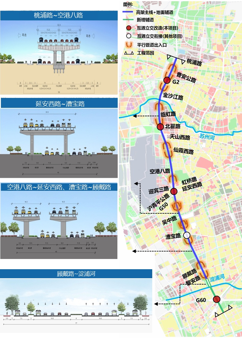 1、新建主线高架,北起桃浦路,南至黎安路,全长约15.3千米,规模为双向8车道,设计速度80千米/小时。