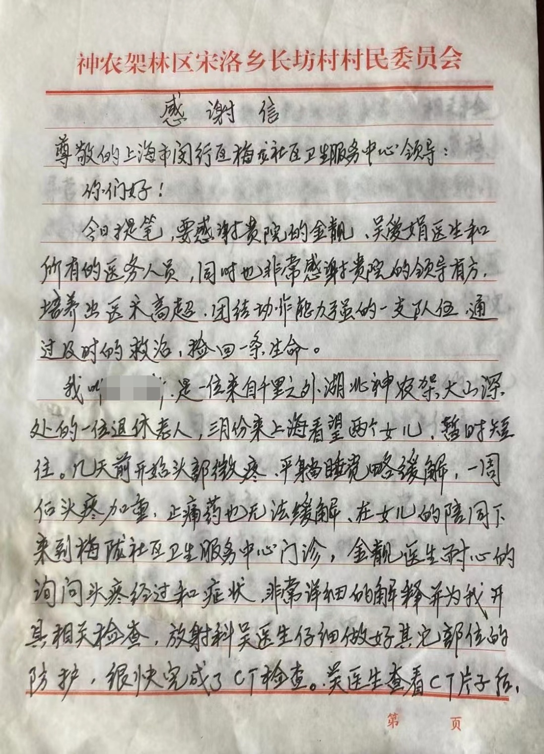 “多亏了你们,让我捡回了一条命!”近期,梅陇社区卫生服务中心收到了一封来自千里之外大山深处的感谢信。写信的是来自湖北神农架的刘老伯,前些日子他来到上海女儿家小住,其间突发头痛,到梅陇社区卫生服务中心检查后被确诊为慢性硬膜下血肿。梅陇社区卫生服务中心通过医联体将其转至闵行区中心医院,因为救治及时,刘老伯不久后康复出院。他回家后便寄来了这封情真意切的信件。