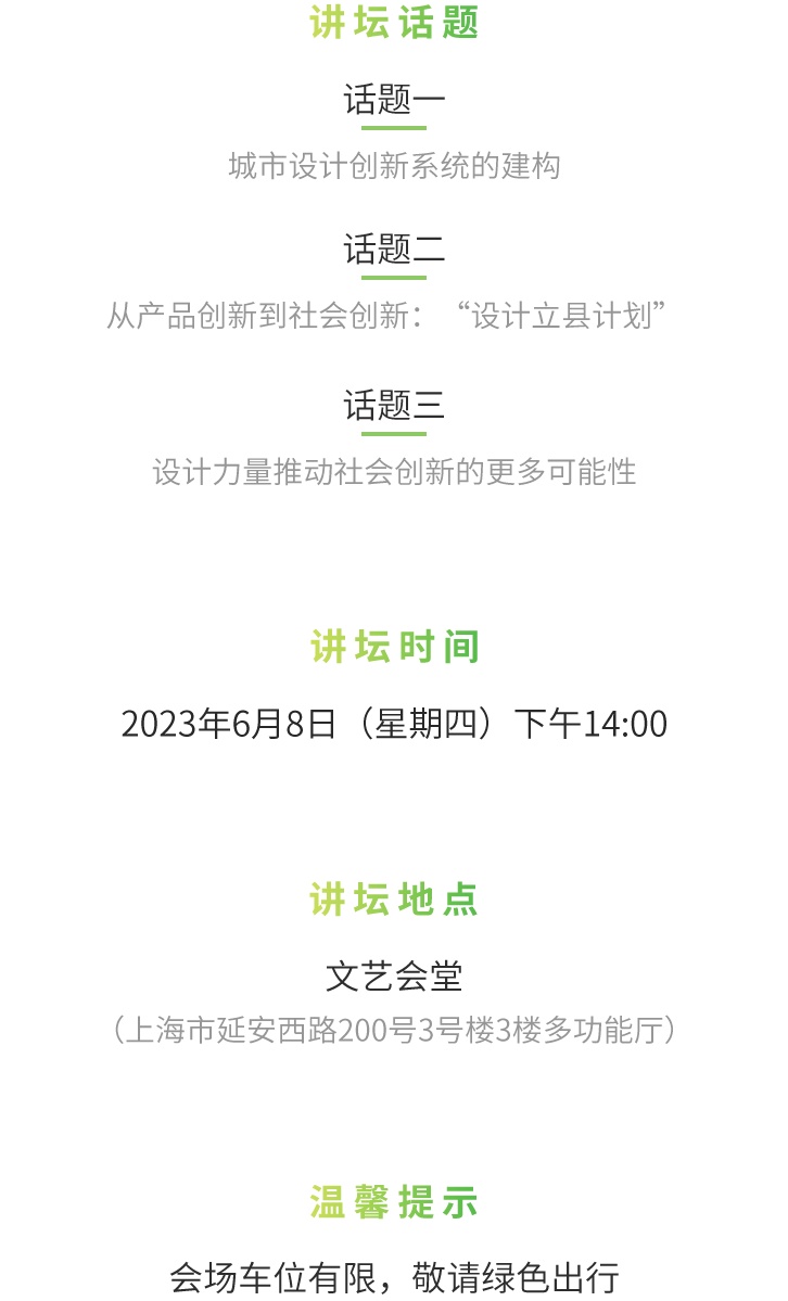2010年至今,上海“设计之都”建设从强调物理层面的设计逐步转向社会系统的设计,关注并强调人与自然、人与社会、人与商业之间的协同共生,取得了诸多发展成果。本期讲坛邀请到十余年来参与、见证和推动上海“设计之都”建设的设计界“大咖”,以围绕城乡融合问题、产业能级提升问题、人民有关幸福生活的诉求问题构建设计系统的具体案例,讲述“用设计推动社会创新”的精彩故事,进而探讨上海在建设世界一流“设计之都”、打造全球“设计创新型城市”的过程中,如何找到上海设计的DNA和核心价值,如何塑造上海“设计之都”的城市品牌。