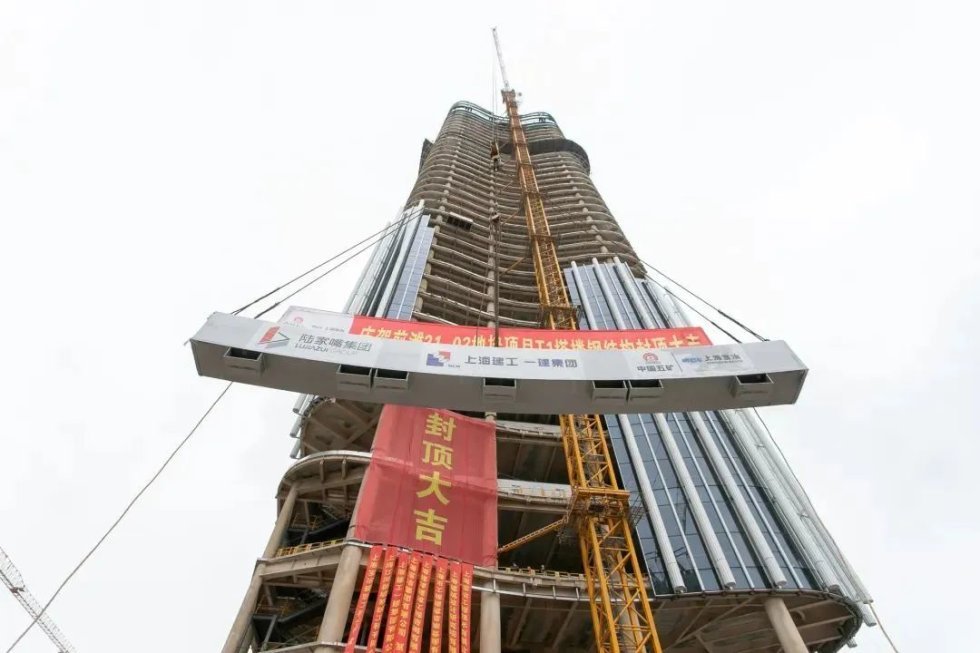 今天,位于前滩国际商务区21号地块、总高195米的T1办公塔楼实现钢结构主体封顶。