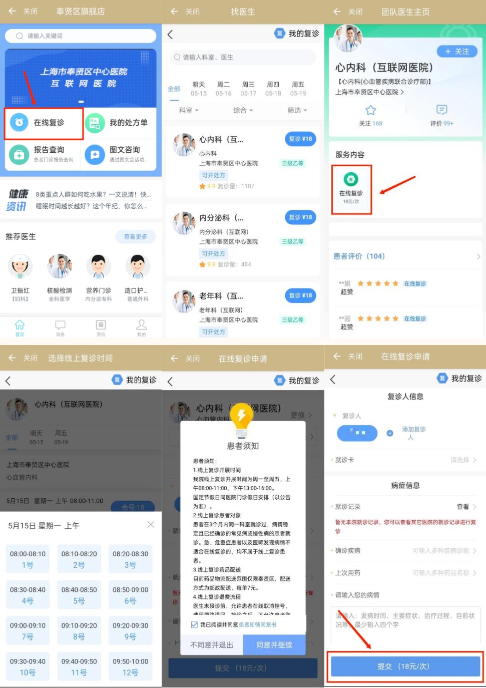 在线复诊:在“互联网医院”首页,点击“在线复诊”→选择科室→点击“在线复诊”→选择时间段和号码→阅读并同意患者须知→填写病症信息→提交并支付预约费用。