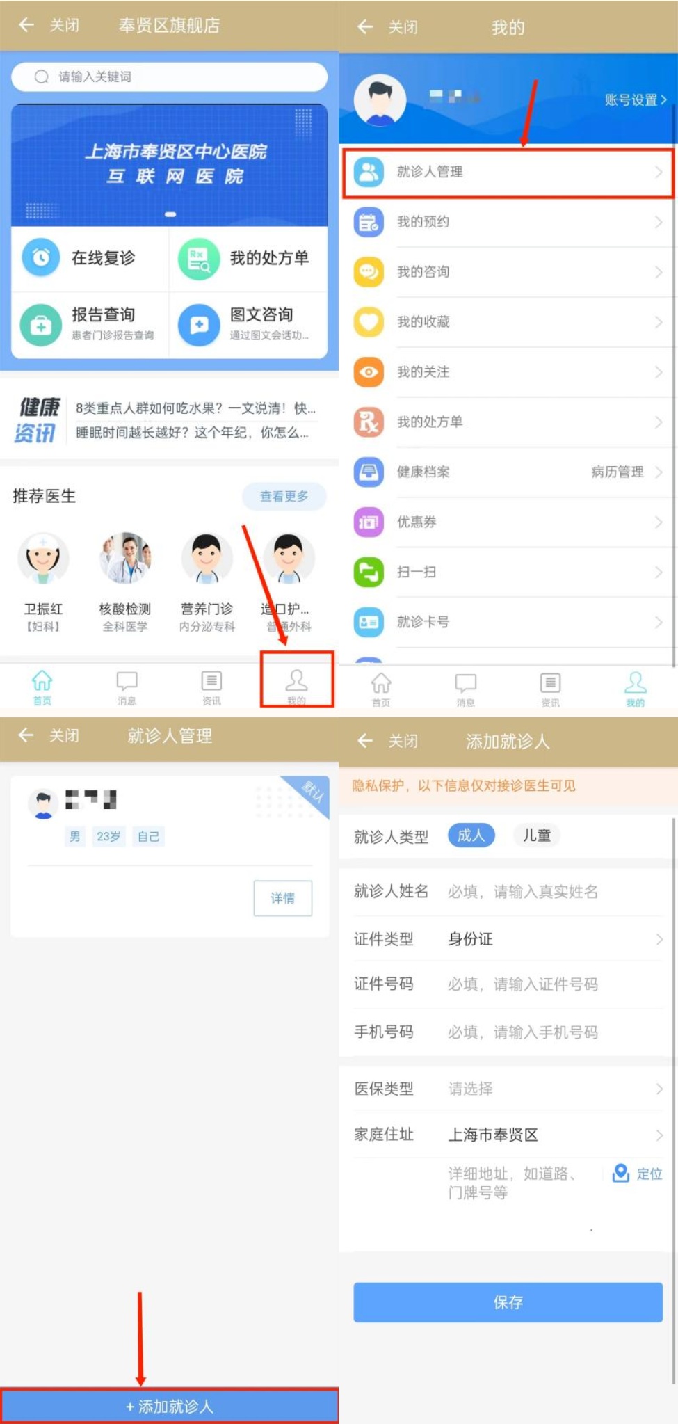 就诊人管理:首次登录时,点击“我的”→“就诊人管理”→“添加就诊人”,按要求填写信息并保持即可完成就诊人添加。