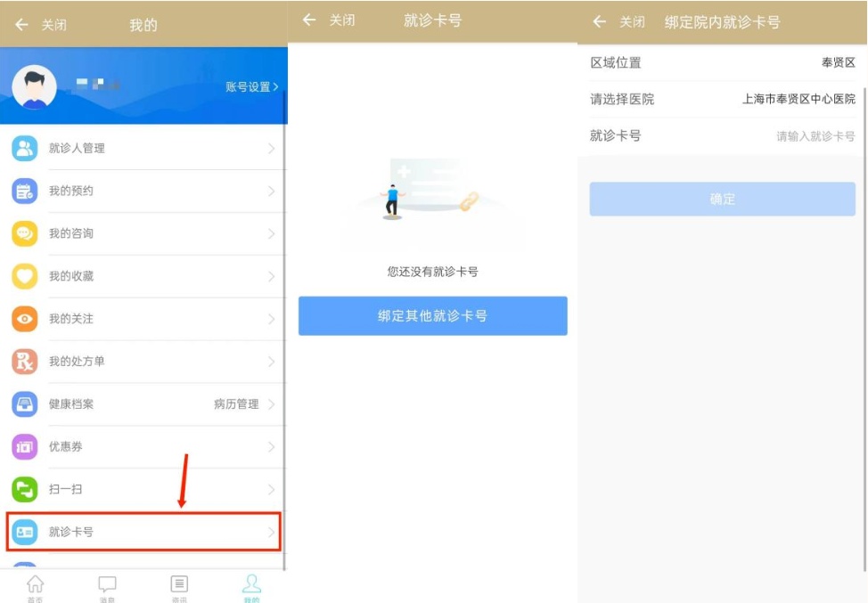 绑定就诊卡:未绑定就诊卡的,点击“我的”→“就诊卡号”→“绑定其他就诊卡号”。