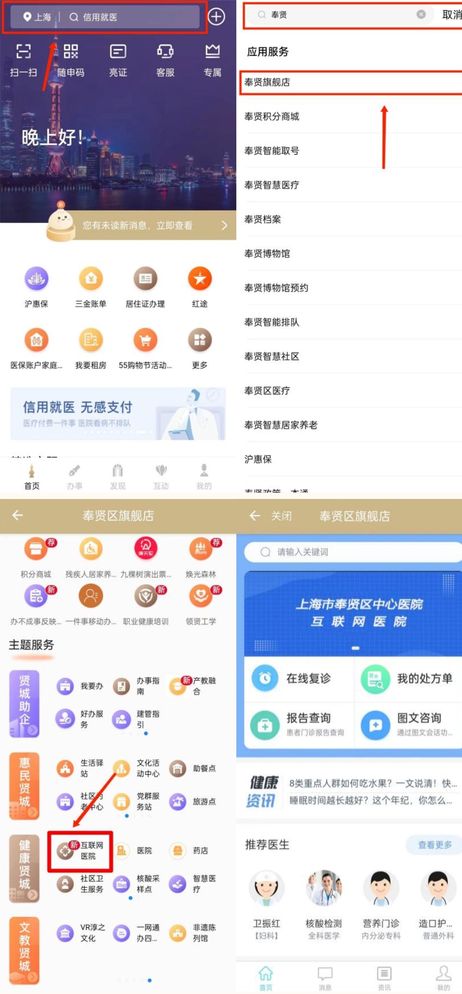 服务入口:打开“随申办市民云”APP,通过“奉贤区旗舰店”进入“互联网医院”主页面。