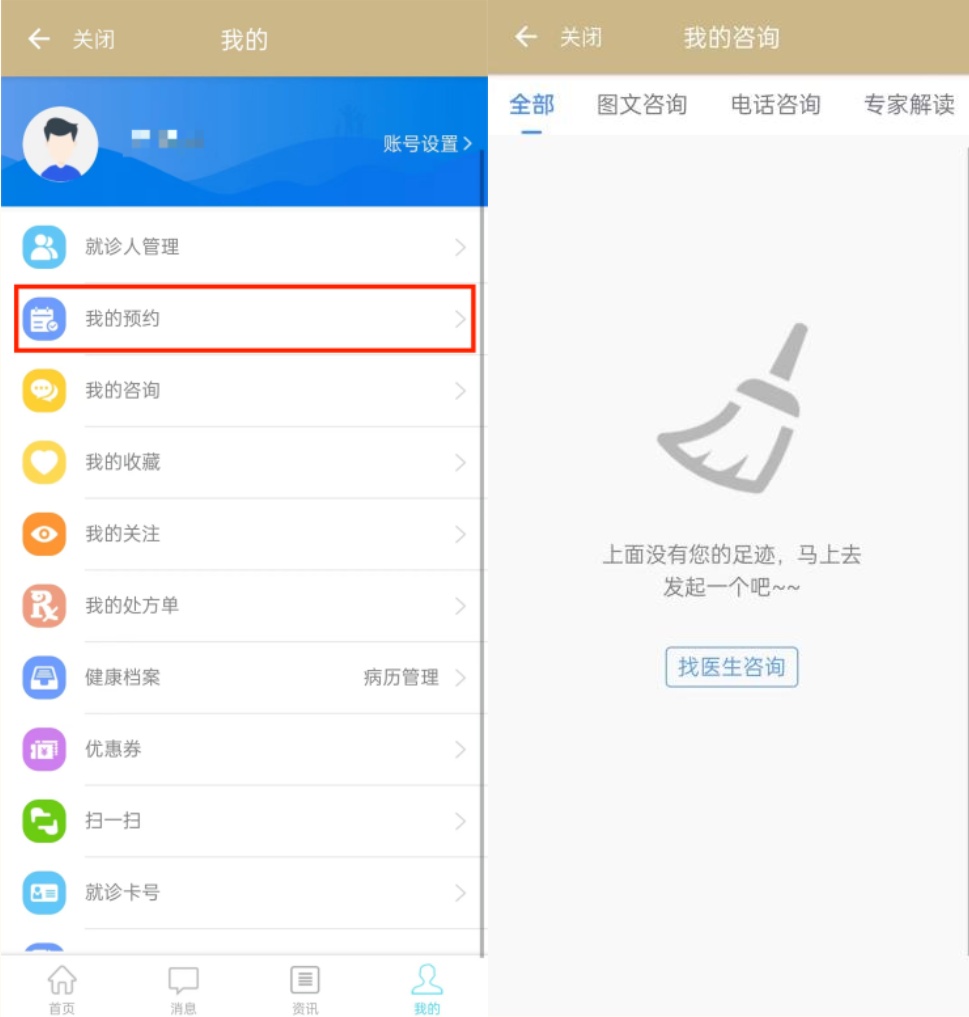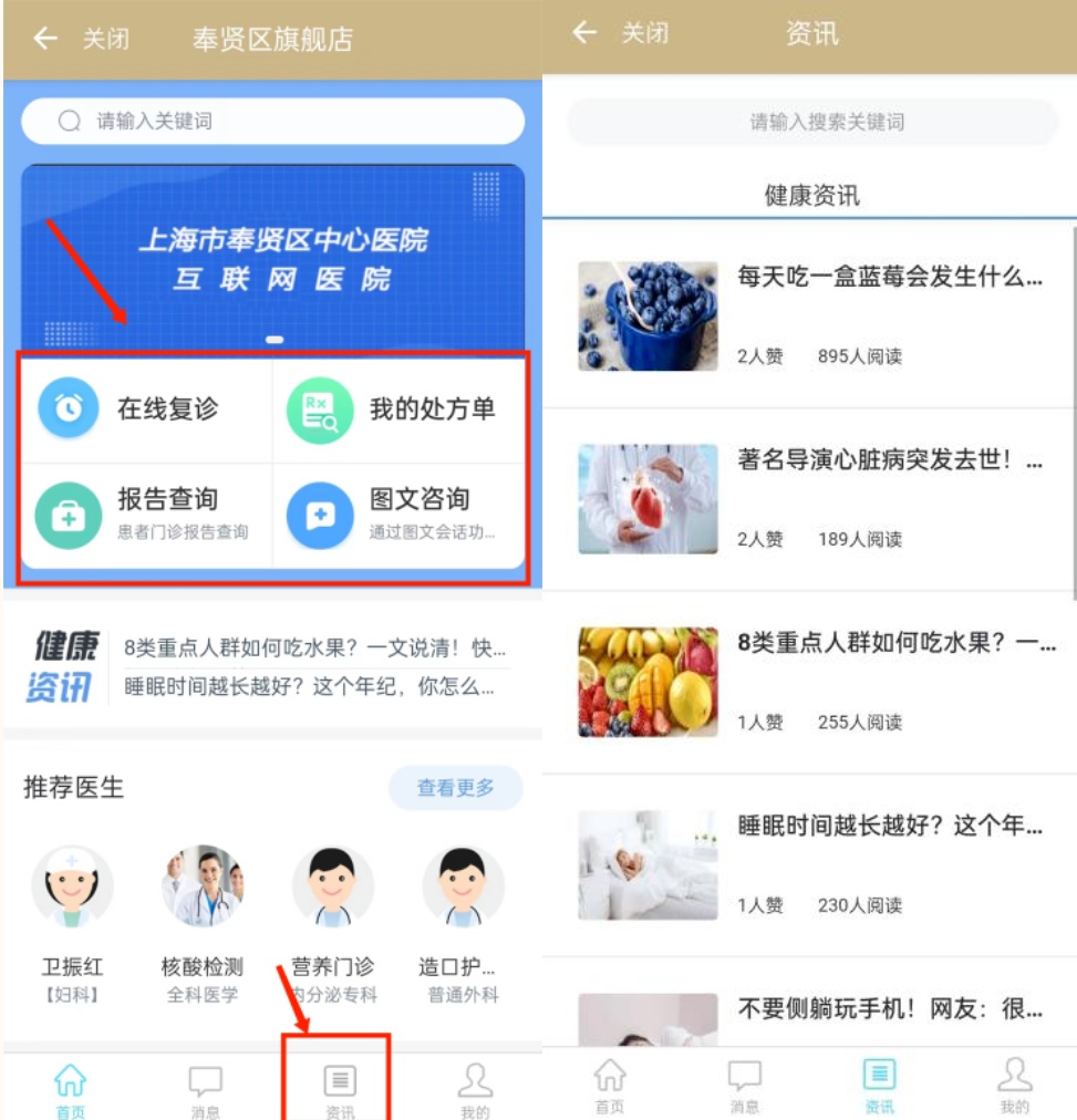 报告查询、查看处方单均可通过“互联网医院”首页点击查看,除此之外,“资讯”频道还会持续更新健康资讯,科普健康知识。