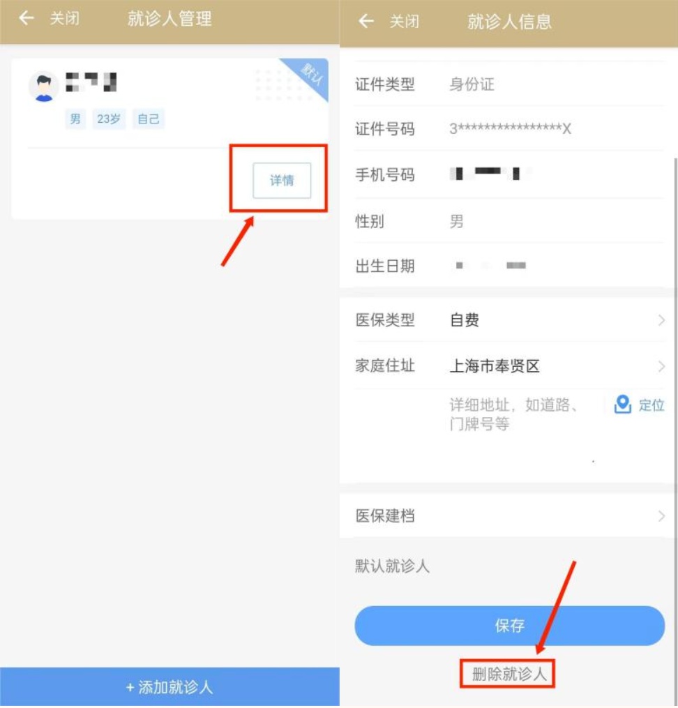 如果需删除就诊人,只要点开详情页面,点击“删除就诊人”即可(不能删除本人)。
