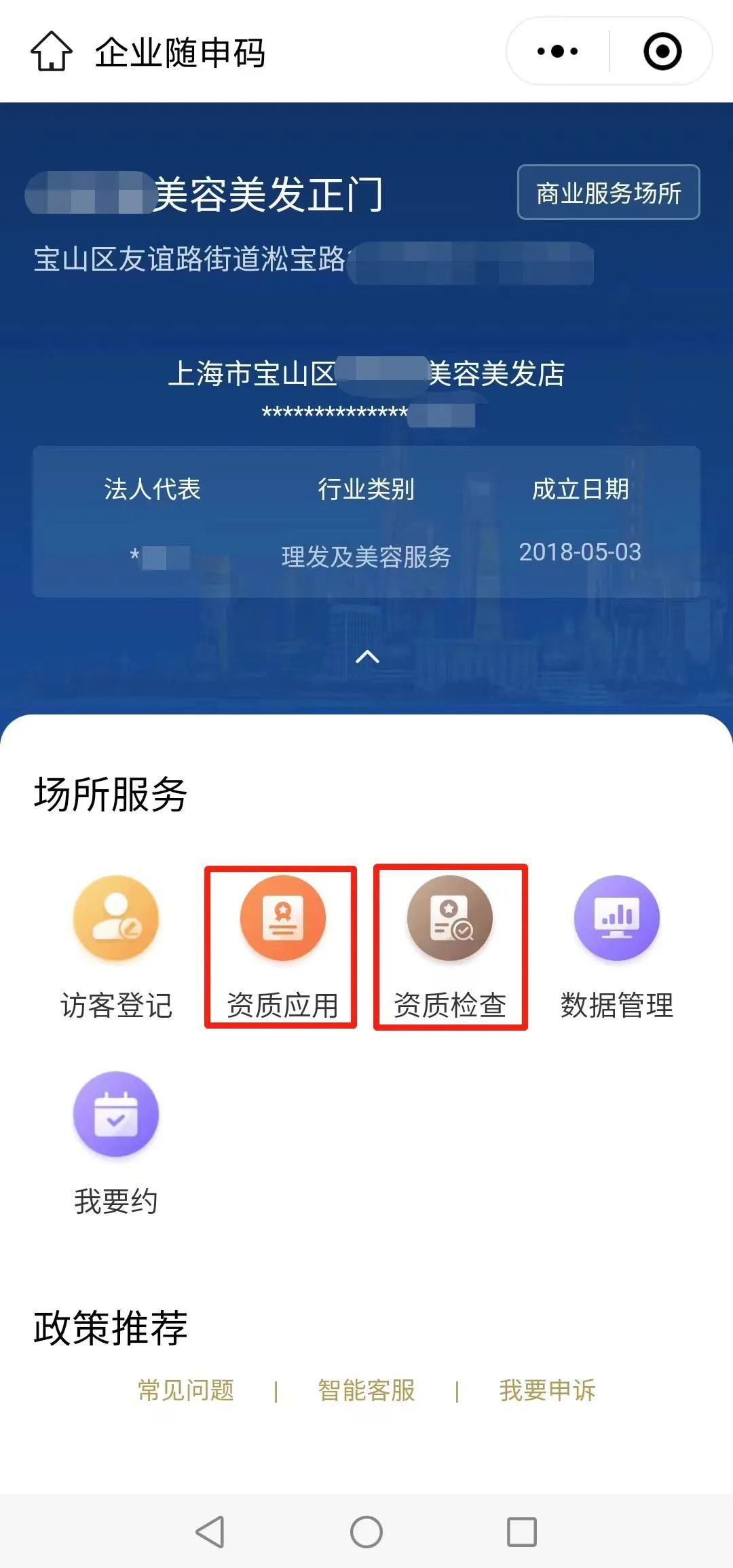 消费者通过“随申办”市民云或微信、支付宝扫描企业“随申码”,点击“资质应用”模块方便快捷查看宝山区美容美发经营主体营业执照、发卡经营者是否已通过本市单用途卡协同监管平台进行信息对接以及信用状况、“双随机”监管结果等企业公开信息,实现“一码公示”。