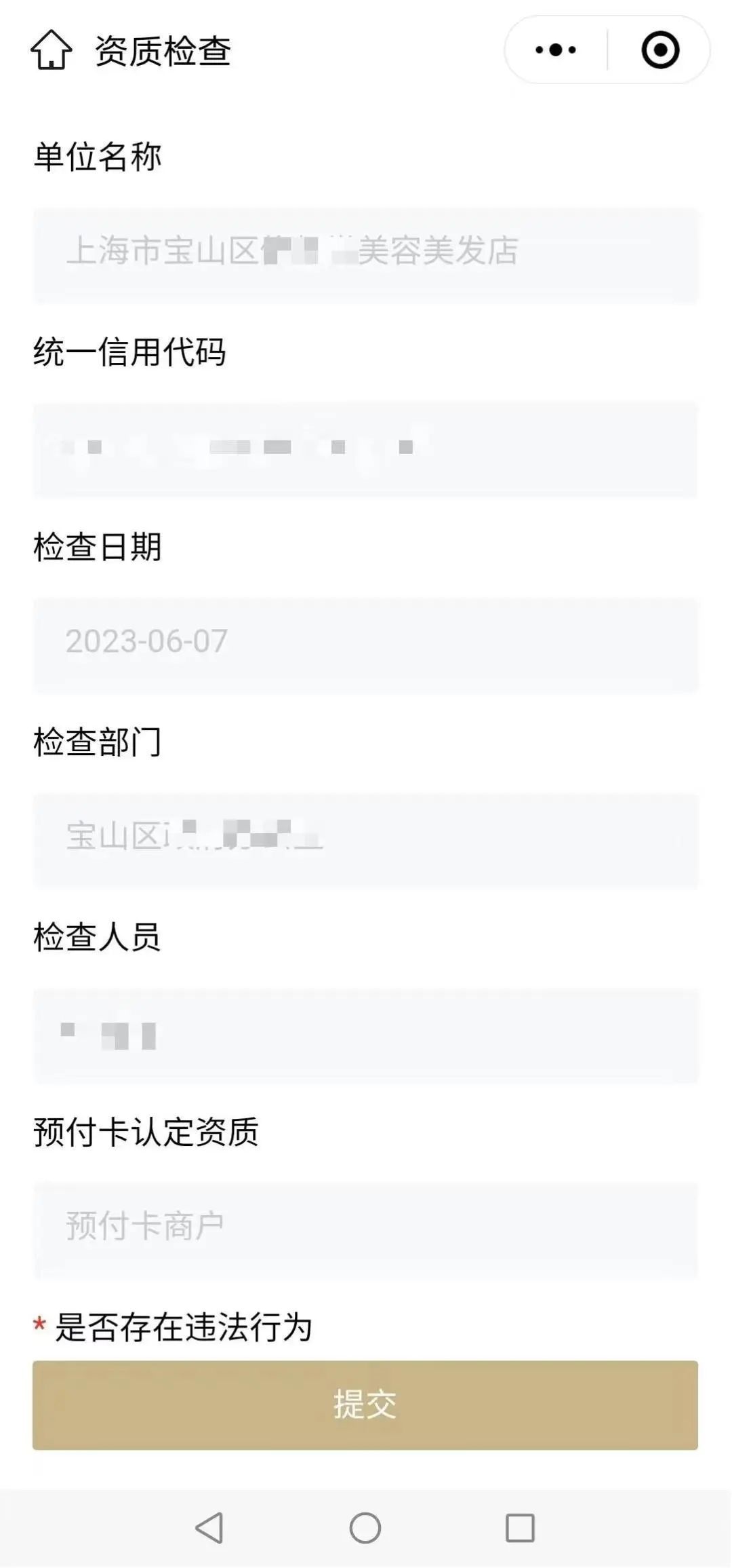 同时,特定执法人员通过扫码,点击“资质检查”模块可获取企业相关信息、预付卡资质等内容,对发现存在违法行为的商户可快速录入上传违法行为,实现“一码核查”。