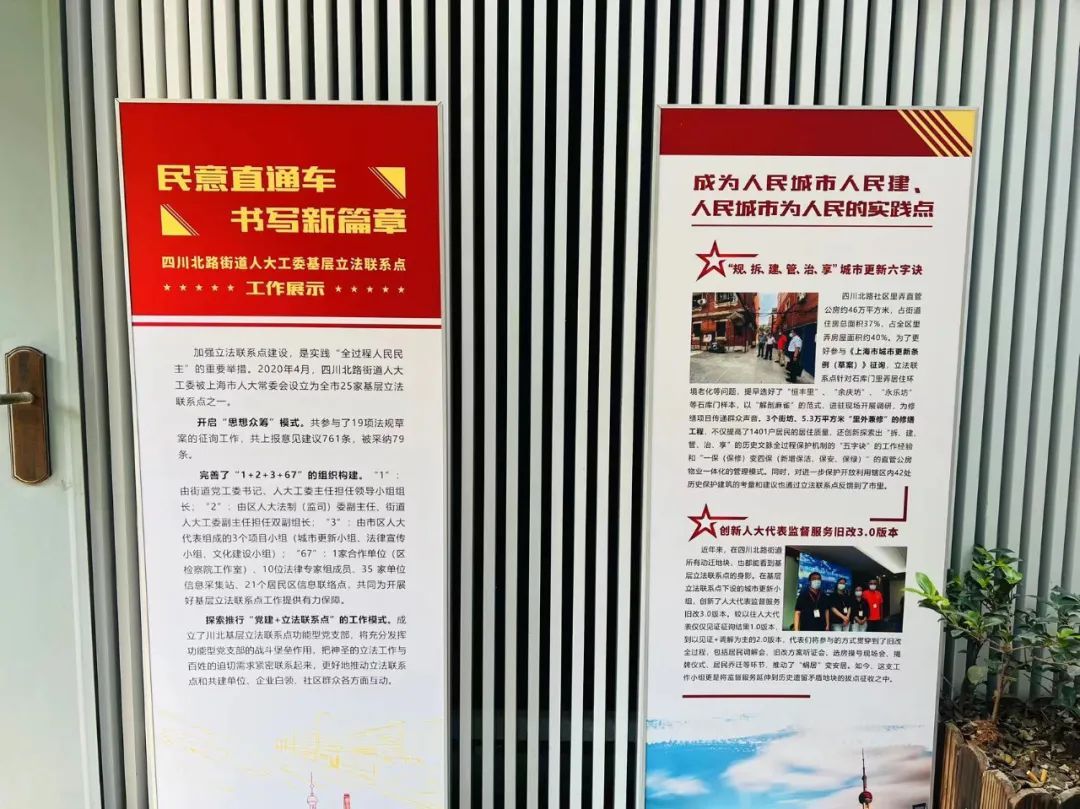 加强立法联系点建设,是实践“全过程人民民主”的重要举措。2020年4月,四川北路街道人大工委被上海市人大常委会设立为全市25家基层立法联系点之一。3年多来,立法联系点共参与了19项法规草案的征询工作,共上报意见建议761条,被采纳79条。