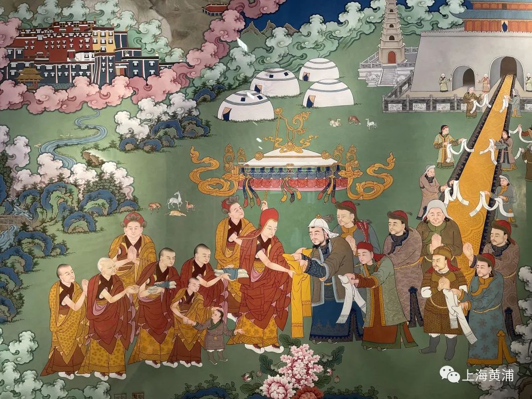 其中最为引人关注的,是来自萨迦寺所藏的17件《八思巴画传》珍贵复制品。珍藏于萨迦寺中的《八思巴画传》是萨迦唐卡艺术的代表。明清之际的萨迦唐卡艺术家从“凉州会谈”等波澜壮阔的历史篇章中取材,创作画传30轴。《画传》完整描绘了爱国高僧八思巴生平,包括随萨迦班智达远赴凉州、首次谒见忽必烈、两次进京、按照中央政府要求在西藏建制封官等事迹。
