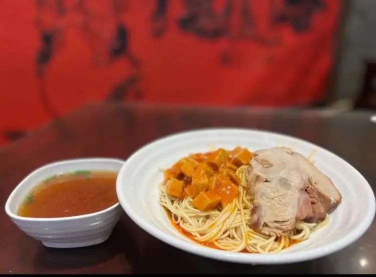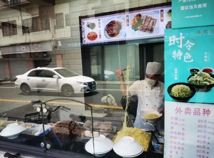 去年刚从附近搬走的一对上海退休夫妇,专门乘了40分钟一号线从新家赶过来,就为了中午这顿面。一碗二两的面条加上焖蹄、辣酱、爆鱼三款浇头,两个人分着吃刚刚好。