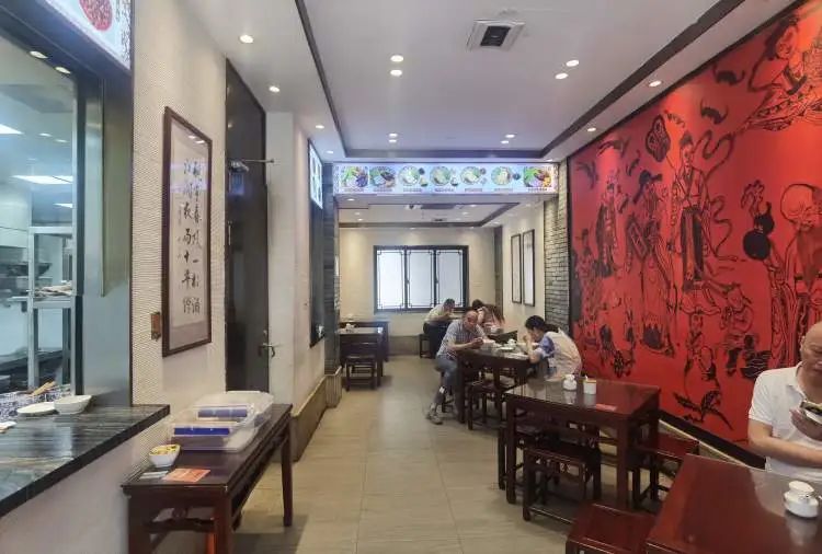 进入店内,左侧是沿街的大玻璃外卖窗口、半开放式透明厨房,厅堂内部七八张桌子,一些食客正低头呼噜呼噜吃面条。天顶多处还挂着不少显示菜品名称的灯箱,右侧则是一大面红底黑描的古风墙画。