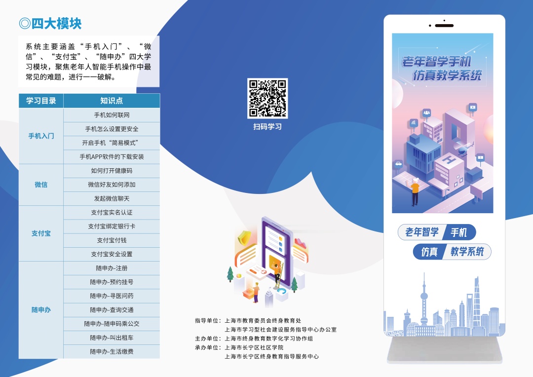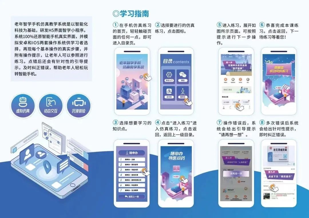 为了更好地发挥“老年智学手机仿真系统”的优势,配套开发了《智能手机仿真学》智能手机交互仿真课程。课程适配手机端与平板端,包含“智能手机随心学”、“老年智能生活”两大版块,内容涵盖“手机入门”“微信”“支付宝”“随申办”四大模块,并配套相应主题微课视频学习资源供老年人自主学习。