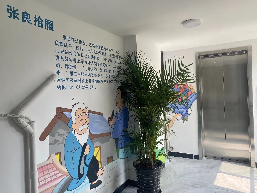 记者在现场看到,除了文明宣传的画作,更多的装饰壁画与中国传统故事相结合,将“杨震拒金”“张良拾履”等诚信文明的寓言故事通过图画和文字展现出来,让居民经过电梯楼道时便能读到这些小故事。