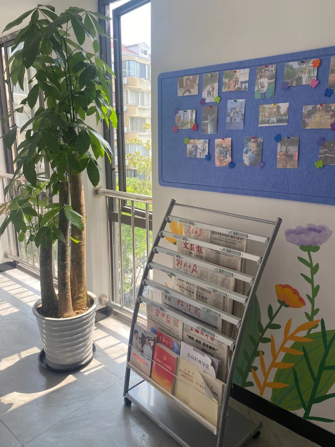 除了画作的装饰,居委还将楼道打造成居民公共活动空间,增设书架、报架、照片墙,方便居民读书看报。“照片墙也是居民们非常喜欢的,上面张贴的都是本栋楼居民参加社区活动的点滴回忆。”邵佳晶说。
