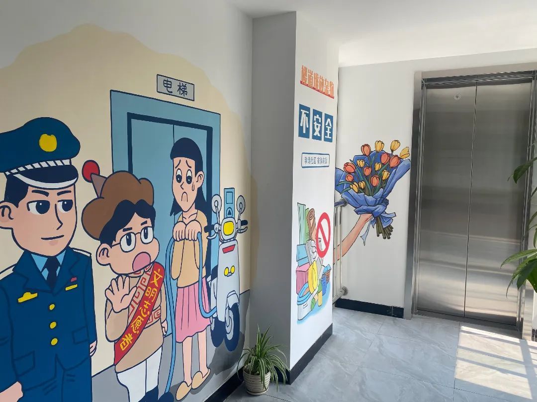 邵佳晶带记者来到居民楼三楼,电梯门一打开,便能看到关于安全宣传的大幅画作——文明志愿者和民警正在告诫居民不要“飞线”充电。邵佳晶说:“这幅画运用了漫画风格,画的人物也都是卡通形象,看上去萌萌的,居民都很喜欢。同时,也起到文明宣传的作用,提醒居民遵守文明准则,规范充电。”