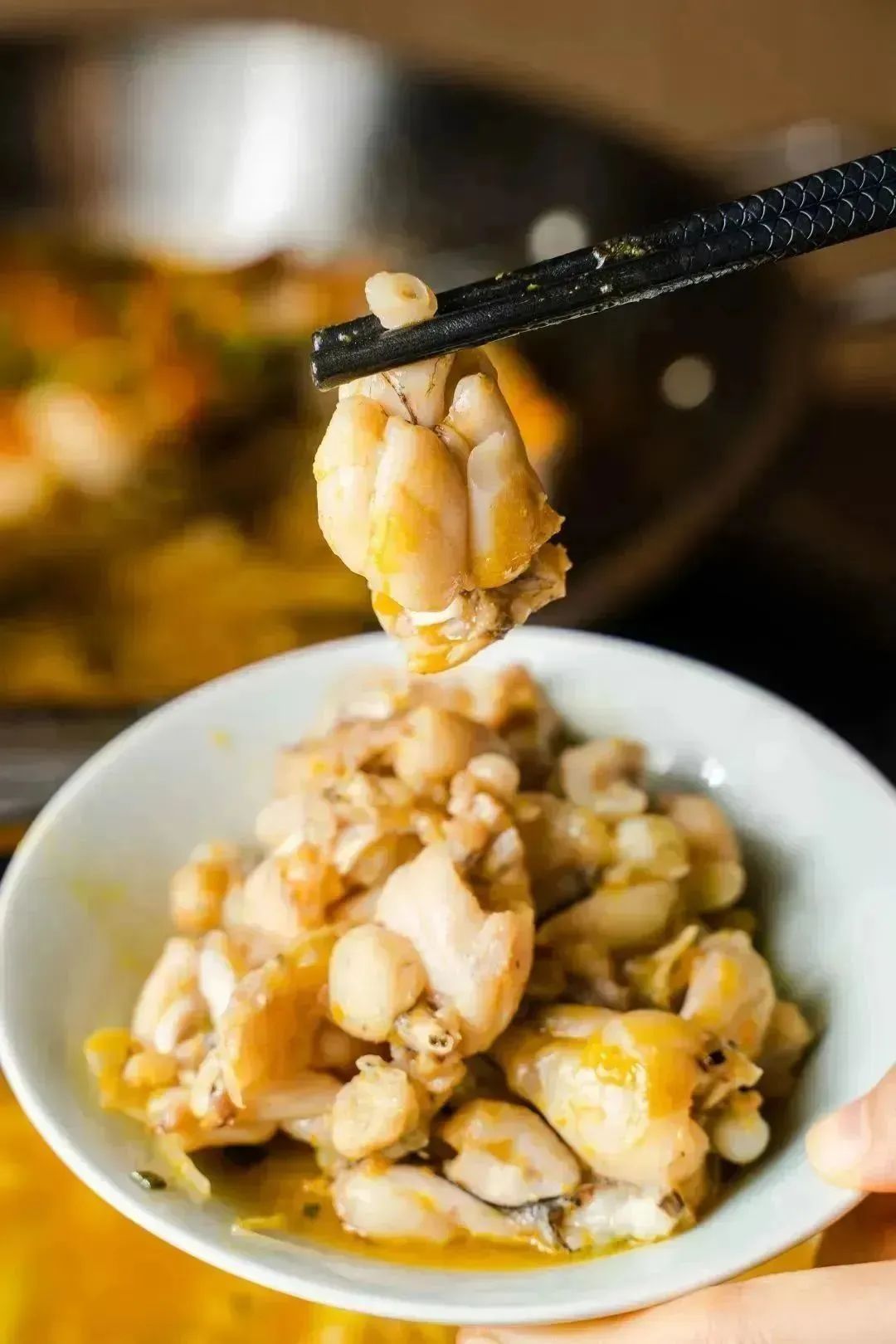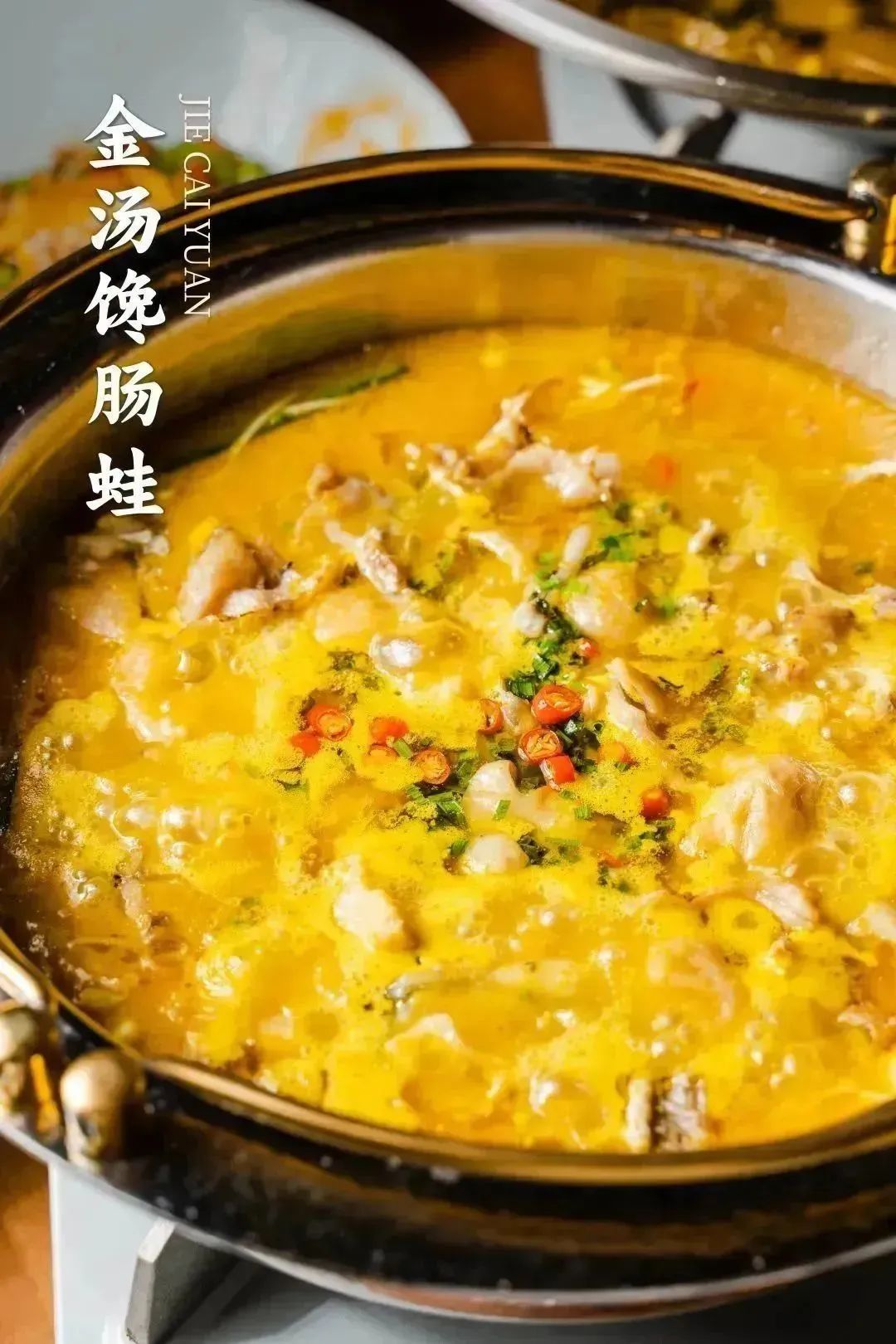 金黄色的浓汤香气四溢,密密麻麻的食材点缀在汤面上。拥有柔嫩肉质和黄金比例的大长腿的蛙蛙,夹起一块,肉质紧实,饱满的蛙肉瞬间从骨头上分离。
