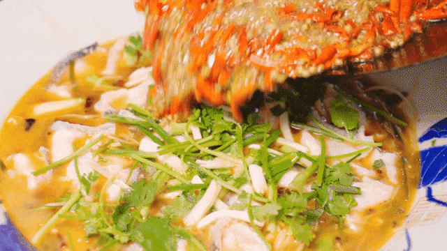 当日新鲜空运而来的黑鱼,活杀现片,再搭配印度椒、小米辣烹制,最后泼上一勺220℃的热油,香气飘飘,瞬间沸腾,唤醒了这一份量级的飘香沸汤鱼。
