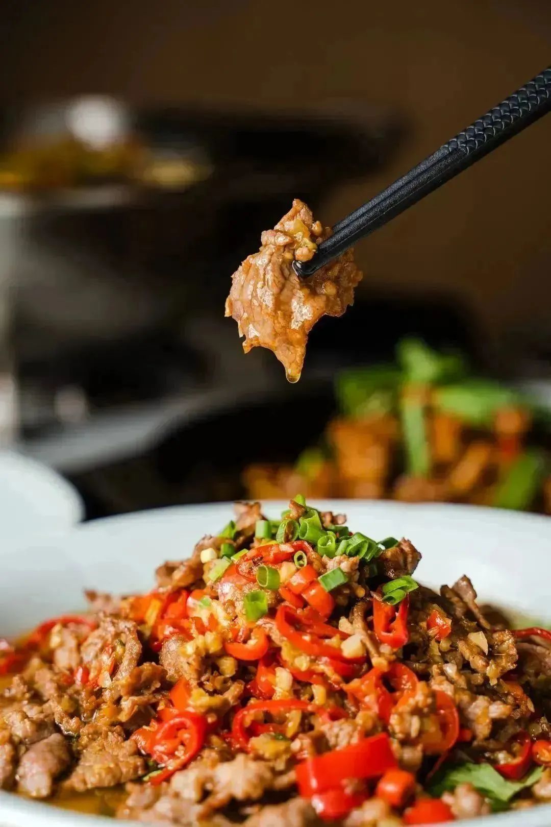 夹起一块牛肉,辣椒的劲辣与牛肉的醇香一同交织在味蕾中,简直欲罢不能!