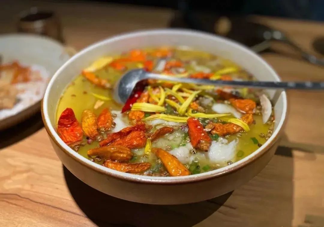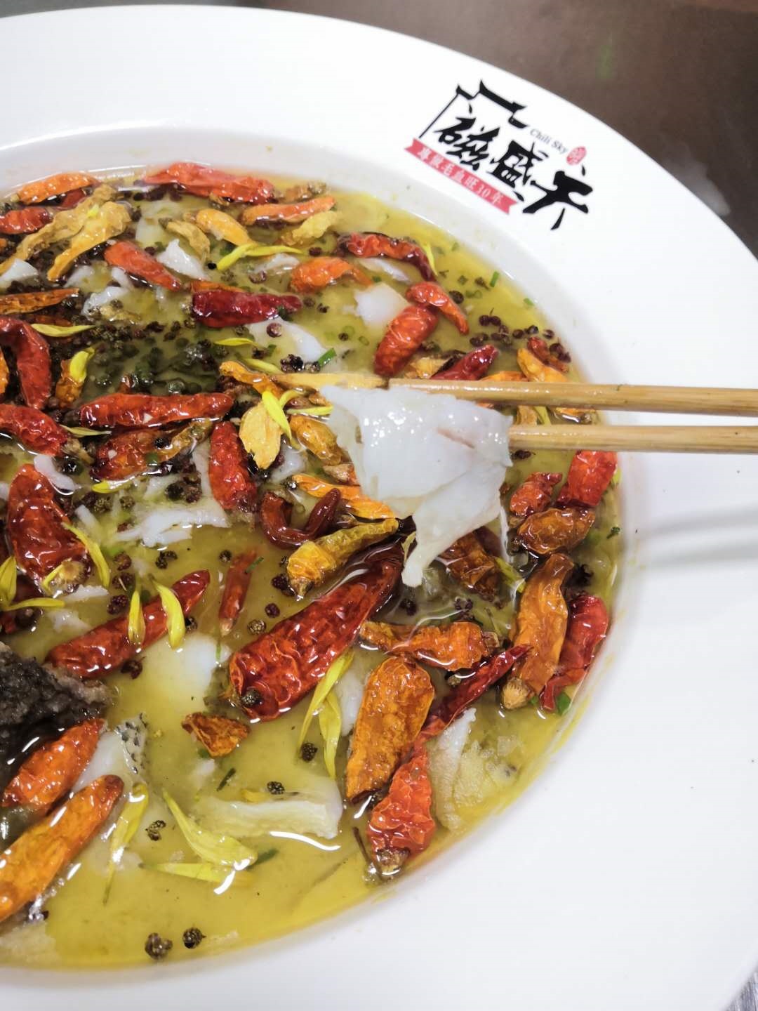 夹起鱼肉,口感嫩爽滑溜,汤头的鲜辣与鱼肉的鲜甜合而为一,那酸、甜、麻、辣、脆五味在味蕾中迸发,吃得根本停不下来。