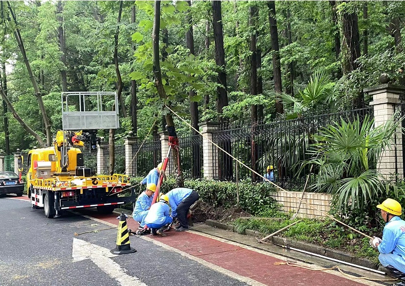 为了避免险情发生,当天早上7时,绿化养护单位开始树木扶正作业。工作人员先行疏剪树木枝叶,再在树干上安装扶正器,待树根周围松土工作完成后,启动牵引扶正作业,最后通过竖支撑桩、拉钢丝等做好加固处理。