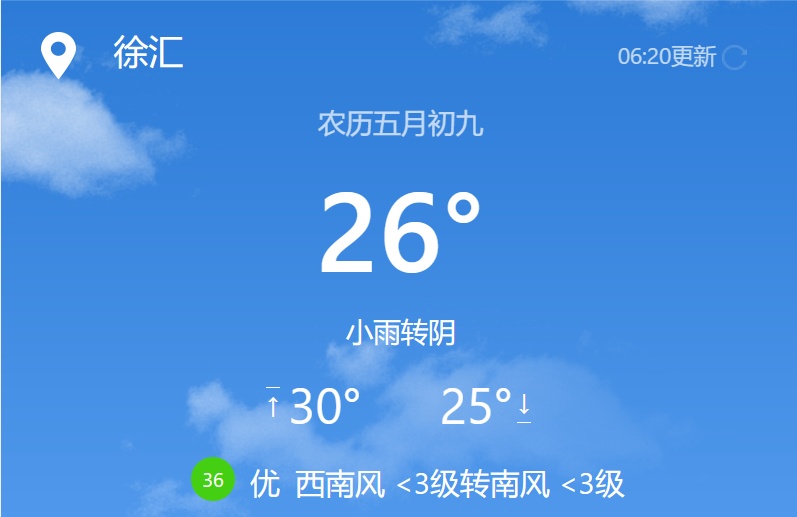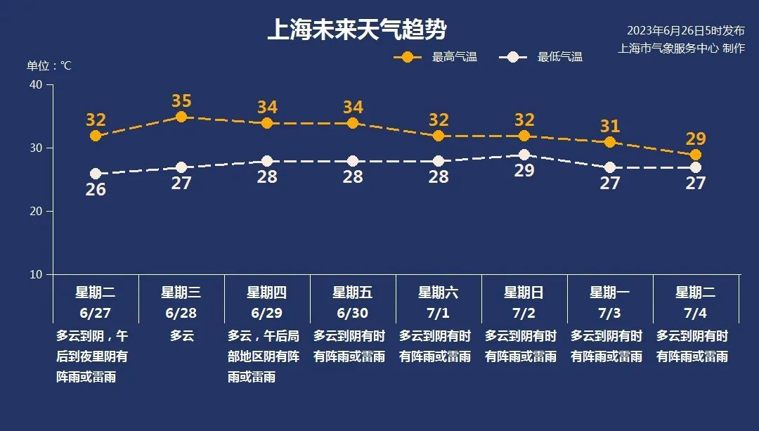 6月27日(周二):多云到阴,午后到夜里阴有阵雨或雷雨,26~32℃