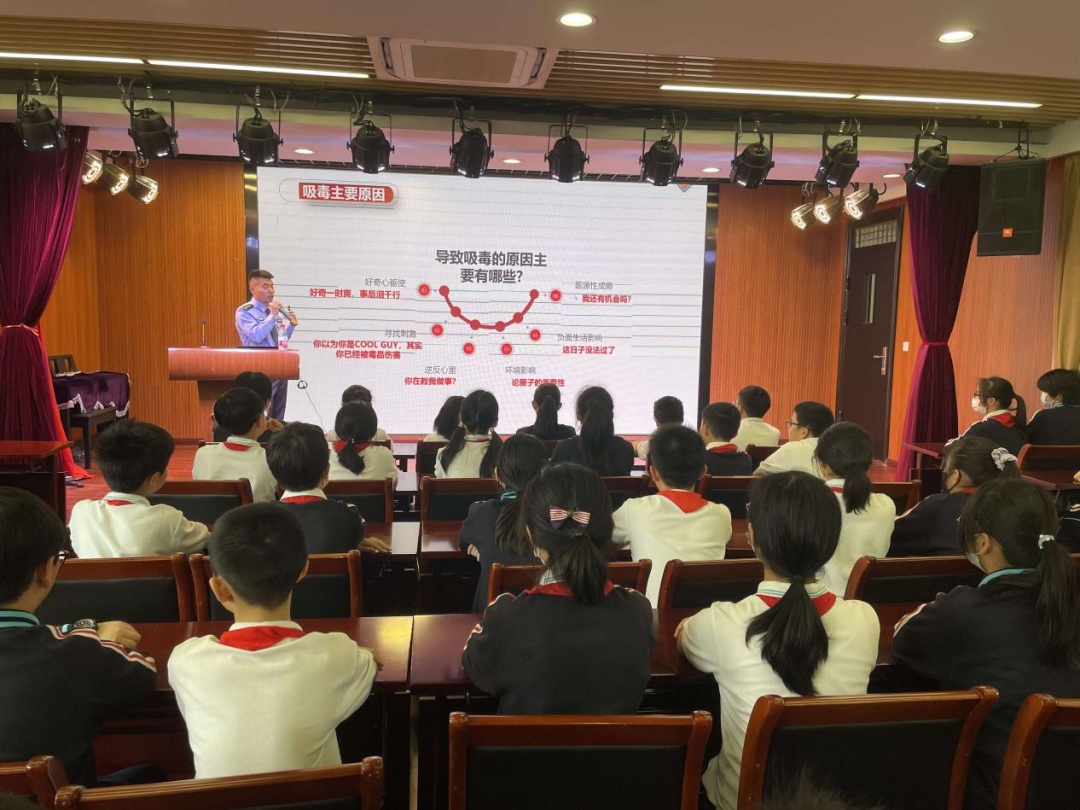 学校利用升旗仪式、大课间活动、校会课,邀请街道禁毒办工作人员、戒毒所警官进校开展禁毒知识宣传,通过有奖问答的形式从毒品的种类、危害、预防为学生讲解禁毒知识,提高学生毒品预防的意识。