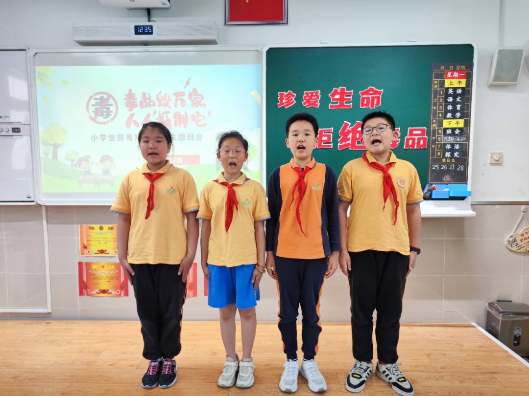 在主题班会上,同学们分享禁毒故事,学习有关正确对待青春期、提高自尊心、调节情绪、面对压力、对待挫折等心理健康知识,提醒同学们拒绝进入歌舞厅等娱乐场所,远离吸毒人群,引导同伴自觉抵御新型毒品的诱惑等。