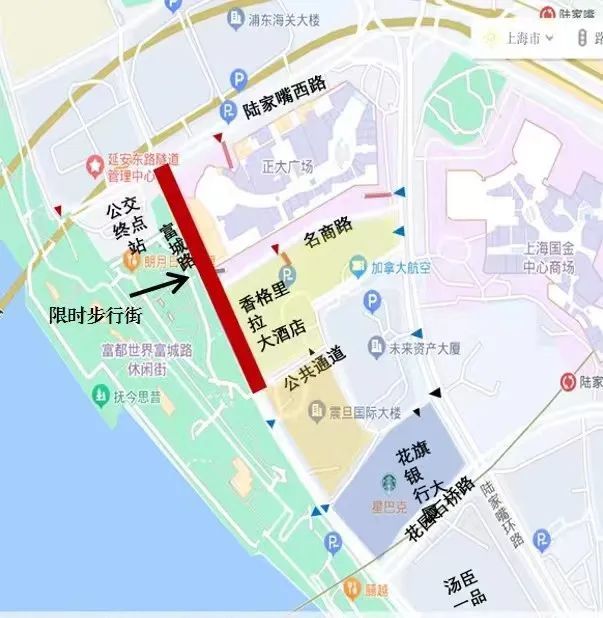 (1)富城路限时步行街期间,机动车、非机动车不予通行,名商路同步封闭,机动车可通过陆家嘴环路等周边道路绕行。