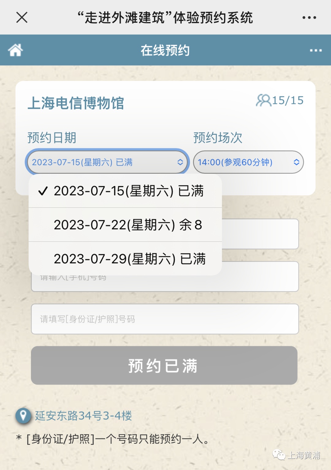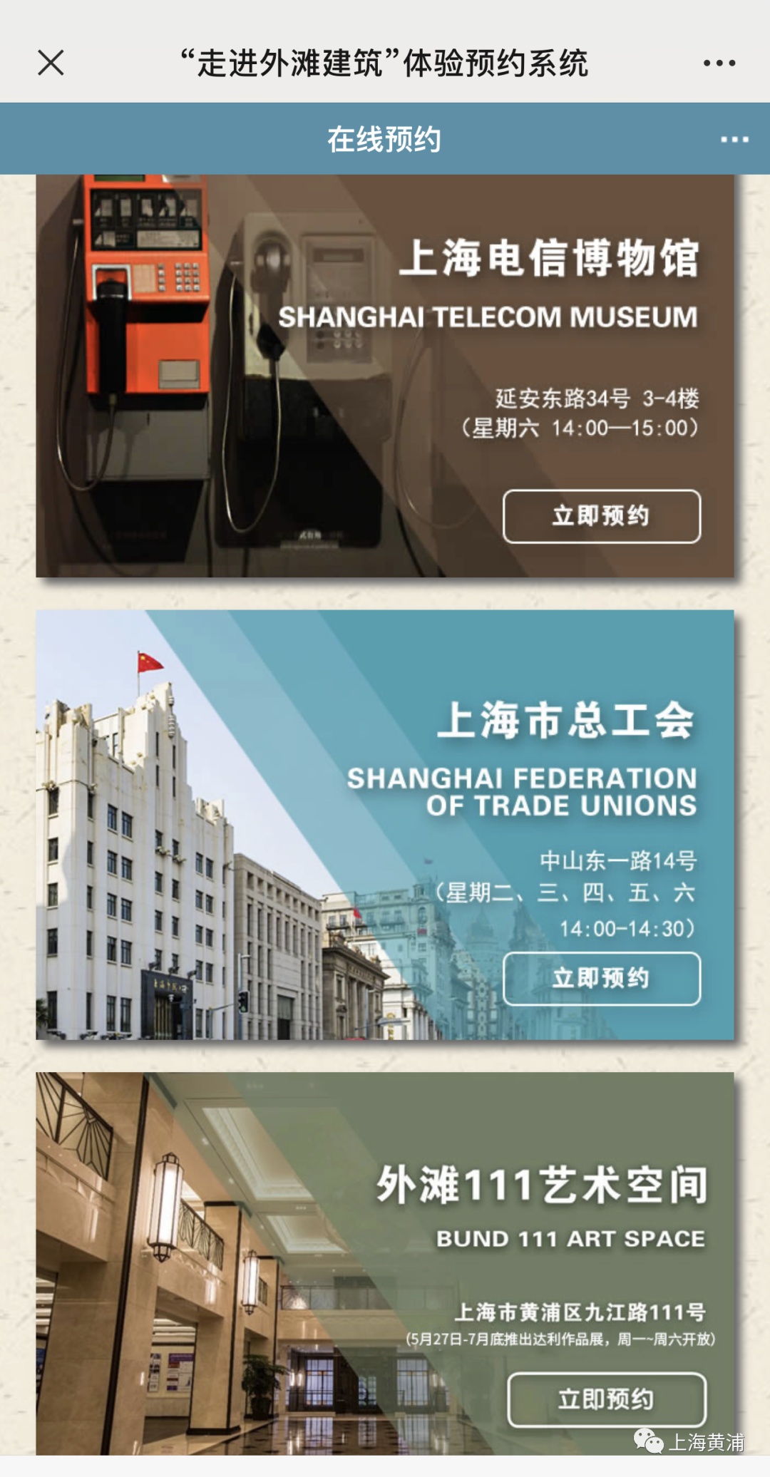 在“黄浦最上海”微信公众号,点击“走进外滩建筑”预约板块,可以看到上海电信博物馆、上海市总工会、外滩111艺术空间和读者书店等4个可预约参观建筑。暑假来临,预约参观的游客人数大增,向来火爆的上海电信博物馆往往是一开放就约满,其他三个建筑的预约“存量”也不多了。