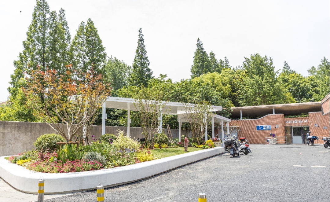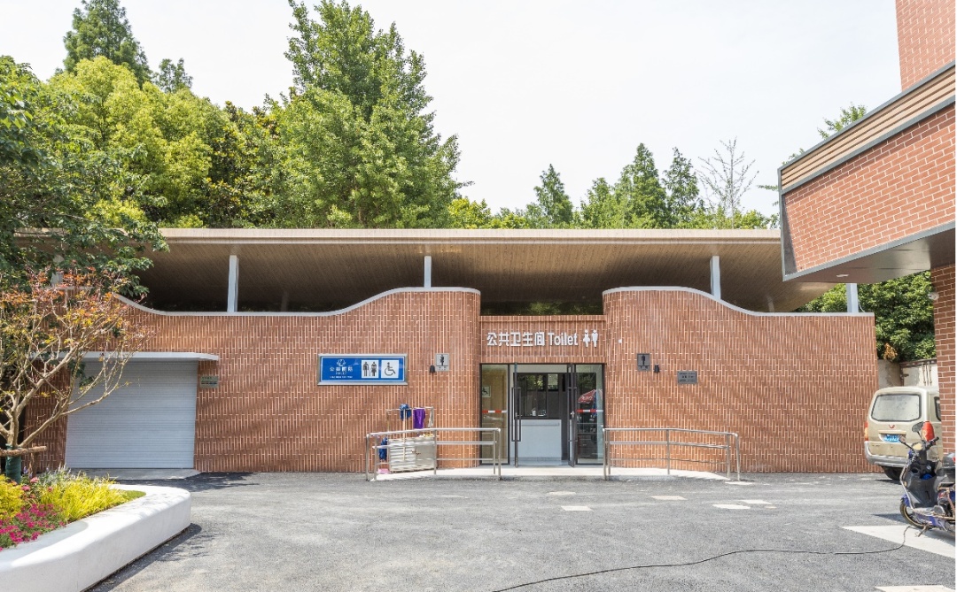 改造后将公厕及垃圾站移至菜场北侧,可释放约500㎡滨河空间,新建公厕与菜场的建筑风格相互统一,暖色的红砖肌理形成的曲面简洁而精致,现代又具有历史风貌的传承。利用滨河闲置空地与菜场西侧通道空间更新口袋花园,增加休憩廊架,打通滨水步道,串联外环绿带,形成全新的社区公共文化空间,为周边居民群众提供了锻炼、健身、休憩的好去处。