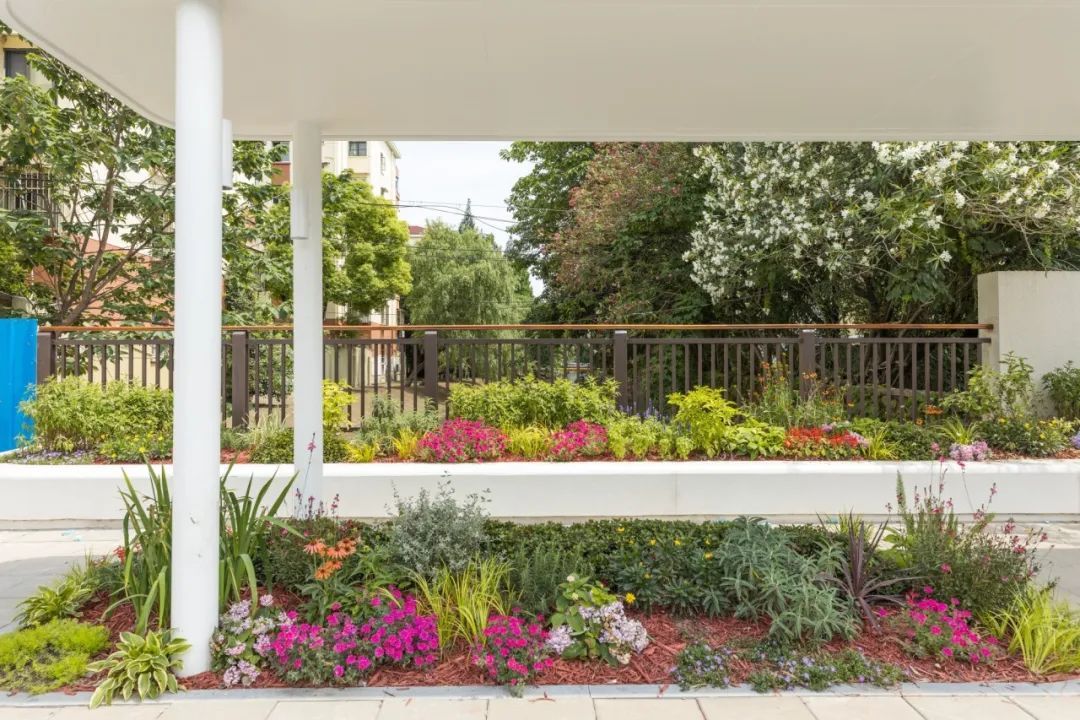 改造后重新规划场地布局,打开了原有封闭绿化空间,结合漫步道合理布置停留休闲节点,打造园林式景观休闲带,使喧嚣的城市中多了一处可安静阅读,花境植物渗透到廊架内部,让整个空间成为可亲密接触植物的场所,创造了一个轻松惬意、充满活力的休闲社交区域。
