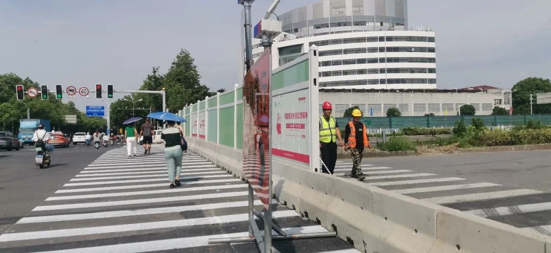 沪闵路银都路口旁便是银都路地铁站,每逢上下班高峰时段,这里的行人与车辆明显增多。记者在施工区域与路口的交界处看到,路口施划待转区与车辆引导线,道路两侧均在醒目位置竖立“车辆慢行”橙红色指示牌,提示过往车辆保持每小时30公里以下车速。两侧非机动车道与机动车道间用护栏隔开,车道内又再分隔出一条人行道,确保人车分流。