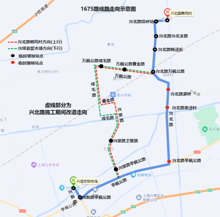 临时取消站点:兴北路亭枫公路、兴北路贵泾村、兴北路泖桥、兴北路塘宝塘。