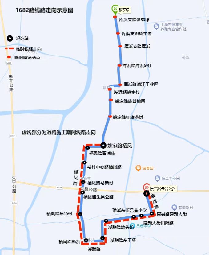 临时取消站点:姚家路红旗港桥、姚家路施普桃园、厍浜路姚家村、厍浜路浦江工业区、厍浜路厍浜9组、厍浜支路厍浜、厍浜支路杨车港、厍浜支路张家埭。