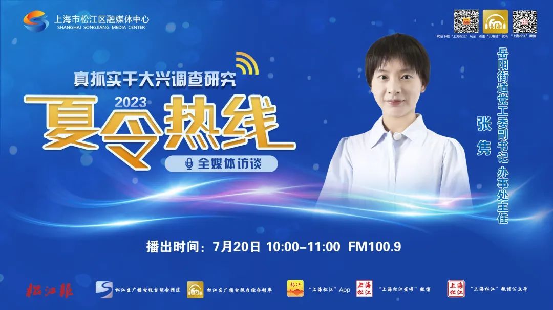 7月20日,以“真抓实干大兴调查研究”为主题的2023年度夏令热线将邀请岳阳街道党工委副书记、办事处主任张隽走进松江区融媒体中心广播可视化直播间,通过视频、音频连线和可视化直播的方式,倾听市民对岳阳街道民生建设、社区治理工作的意见建议,解决市民的急难愁盼。