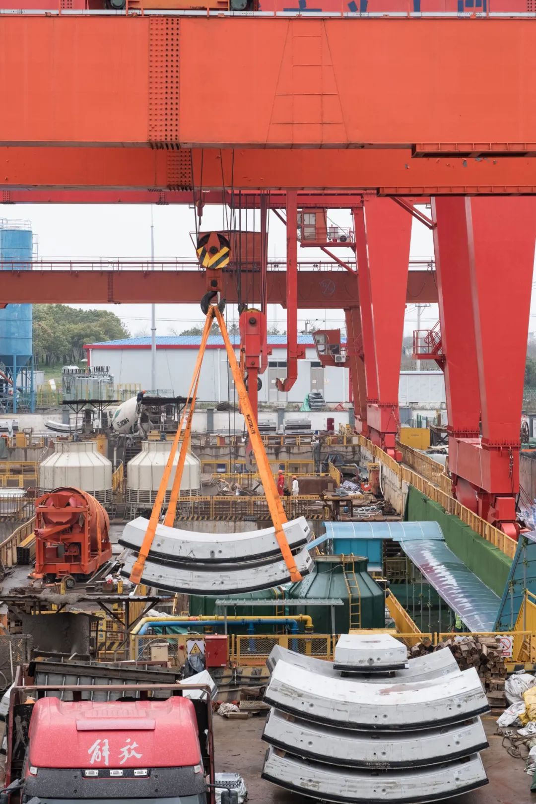 12标7#风井结构内净空尺寸较小,施工可利用场地仅为1.2万平方米,施工作业难度很大,一方面需要完成四台盾构机在不同区间的始发,另一方面也要保障日均消耗40环的管片堆场和日均500辆土方车的运输。面对困难,项目团队首先制定始发顺序,以“X”型从不同推进方向进行始发,同时根据每日施工消耗管片量及时调整施工场布,确保满足2至3天施工量的管片堆场。为满足高峰期接近600辆土方车的运输,项目团队提前与土方卸点和土方运输单位沟通,最终完成了130万方土方量的运输。