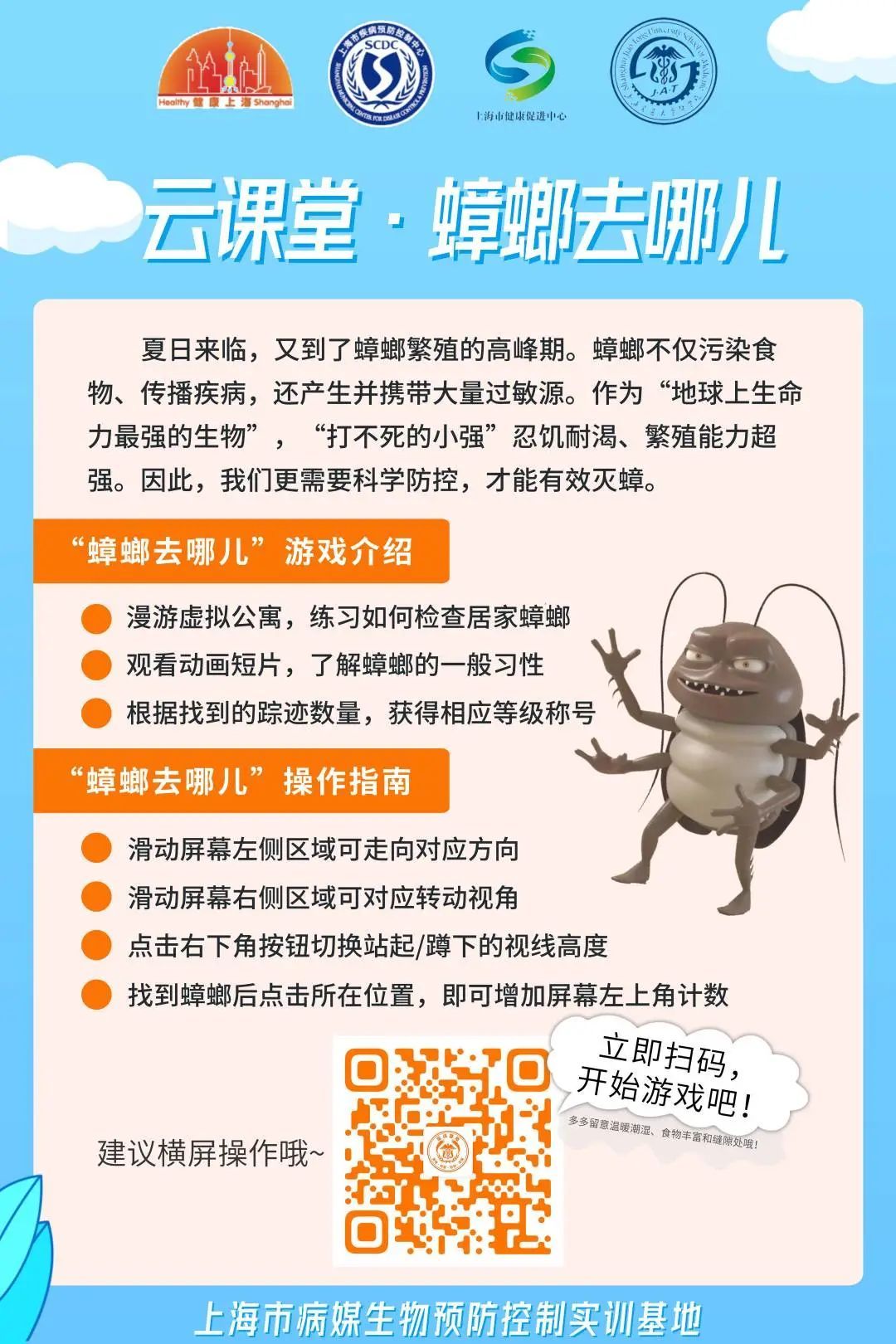 本市启动今年夏季第二次蚊虫集中控制周活动,夏季灭蟑同步开展。市爱卫办等特别举办夏季居家病媒生物防制宣传活动,市病媒生物防制实训基地发布“居家病媒生物防制之蟑螂在哪儿”互动游戏课程。全社会行动起来,共同防制虫害,健康安心度夏。
