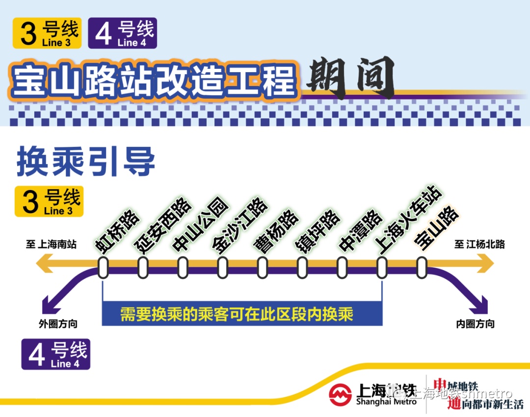 另外,建议顺时针方向3、4号线换乘的乘客,不要积压到宝山路站再换乘,请在宝山路站前的3、4号线另外8座共线站(虹桥路站—上海火车站站)提前换乘,降低可能的客流集聚风险。
