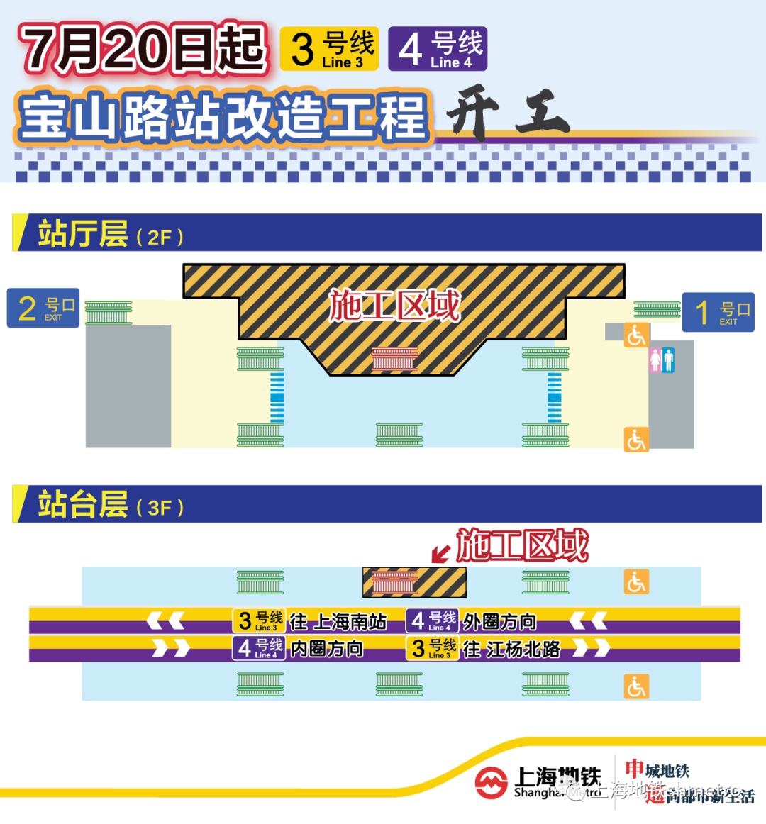 在此期间,宝山路站下行(3号线宝山路站→上海南站方向、4号线宝山路站→中山公园站→宜山路站方向)中部一组自动扶梯及步道楼梯将临时封闭,提醒乘客从站台前后两端自动扶梯或步道楼梯上下楼,此外站台也有一部分候车区域将封闭施工,请乘客按照临时导向指引,在站台有序乘车。