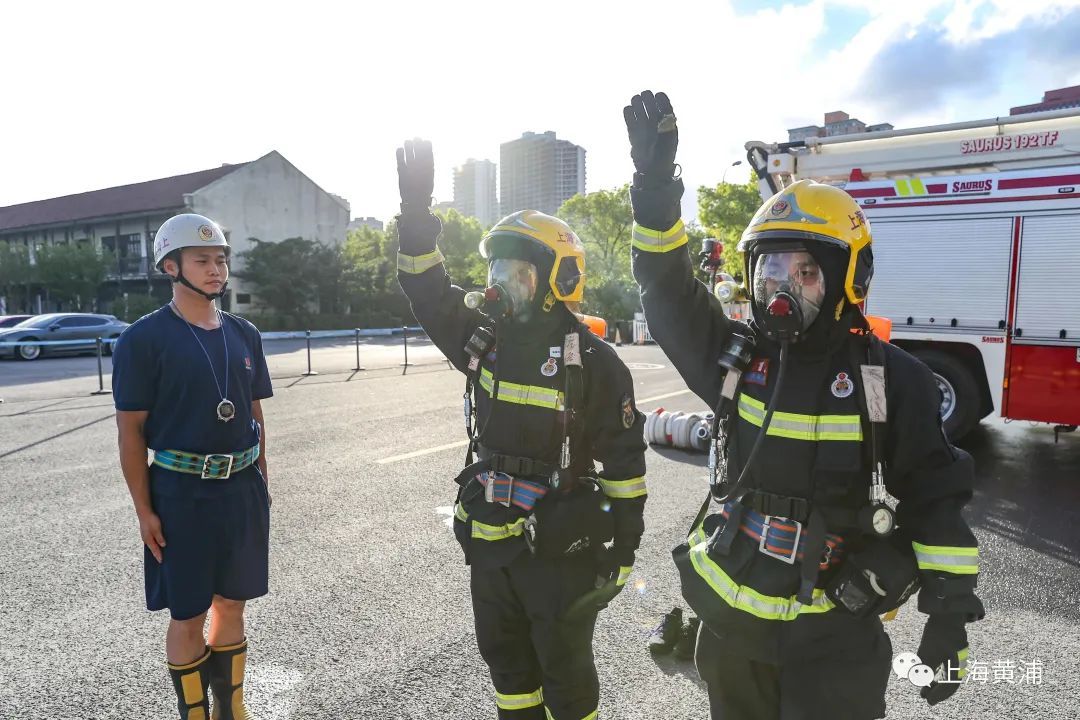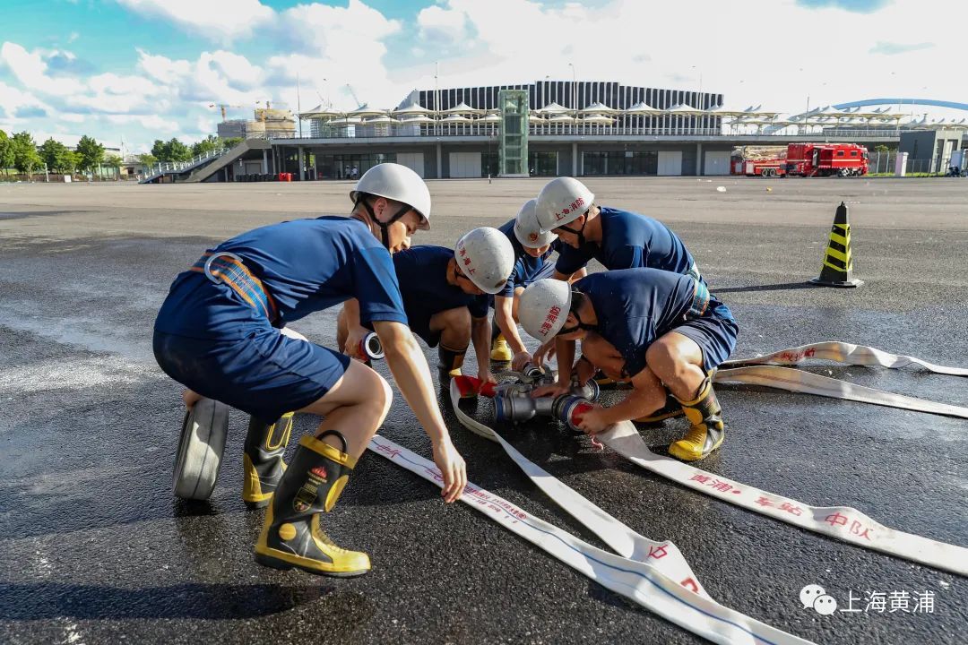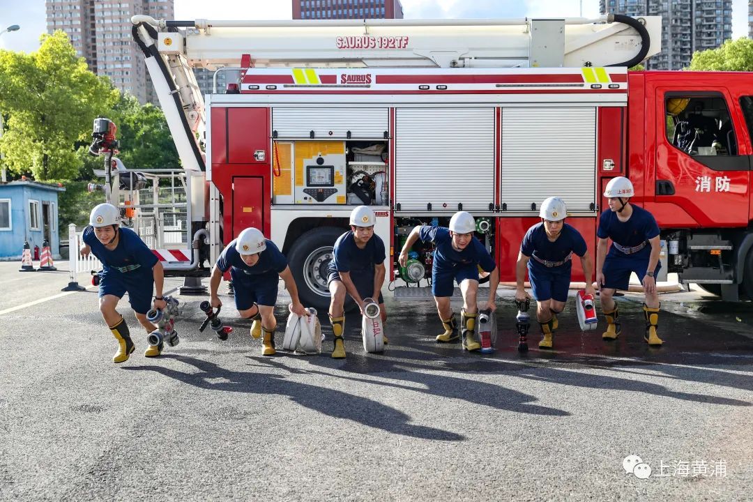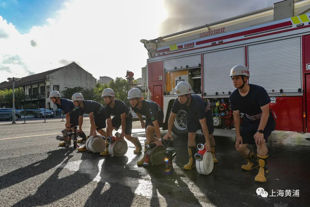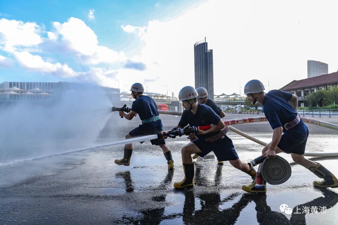 “准备,321,开始”一声有力的口令响彻在黄浦滨江船舶馆外,伴随着头顶的烈日,上海市黄浦区车站消防救援站的消防员们拉开了一天的常规训练。