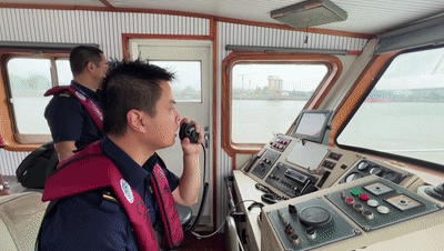 当天上午,记者在闵行海事局西渡海巡执法大队监控室看到,两艘载运钢箱梁的运输船分别停泊于66号墩两侧,由桥面吊机将箱梁提升至桥面高度。执法人员全程实时监控作业,查看电子巡航防线。管控前1小时,西渡海巡执法大队提前布好电子巡航警戒线,通过电子巡航从辖区外10多海里外的分水龙王庙、松浦三桥提前介入监管,利用电话与甚高频对船舶逐条进行管控信息提醒,建议上行船及下行大型船舶、高速船在安全水域暂时靠泊。