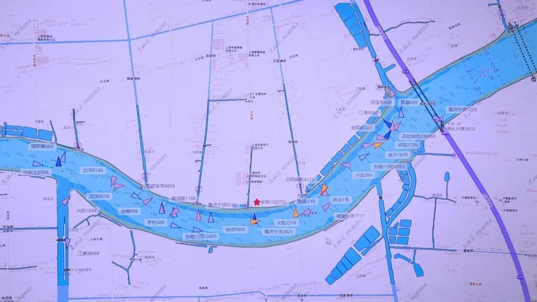 “大家在电子巡航屏幕上看到这一个个三角形代表一艘艘船舶,施工区域奉浦东桥段就是紫色这个区域。”西渡海巡执法大队大队长潘晓峰解释道:“我们现场一共设置了三道防线,最远端通过电子巡航在松浦大桥进行预控,然后在闵浦三桥有巡逻艇进行现场拦截,还有一艘巡逻艇在施工区域进行现场保障。”