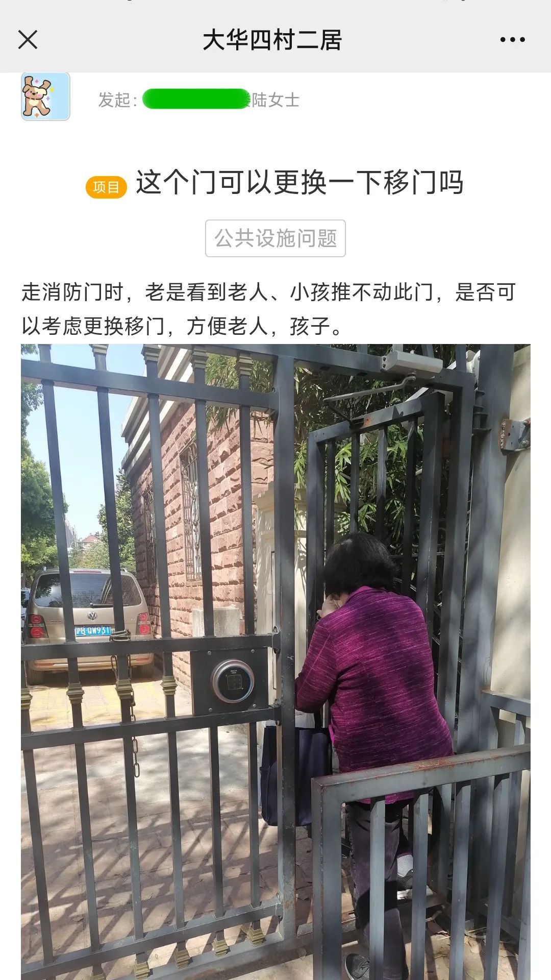 “走消防门时,总是看到老人、小孩推不动此门,是否可以考虑更换移门,方便老人、孩子同行。”一则简短却充满关爱的提议,在大华四村二居的“社区通”议事厅引起不少共鸣,也引起居民区党总支的关注。